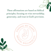Finding My Happy's biblical-based Financial Affirmations combines the power of faith and positive declarations to transform how you view money, provision, and abundance. Rooted in scripture, these affirmations remind you of God’s promises for prosperity, stewardship, and financial peace. Perfect for daily meditation, prayer time, or whenever you need to strengthen your confidence in God’s ability to provide.
