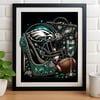 Elevate your love for football with this Eagles Glam Game Day digital artwork — the perfect fusion of sports passion and high-end fashion. This stunning image features a Philadelphia Eagles football helmet encrusted with sparkling diamonds, paired with a bedazzled stiletto heel in vibrant green and black team colors. A matching luxury purse and an elegant champagne flute, each featuring the official Eagles logo and shimmering jewel details, complete this bold and fashionable layout.