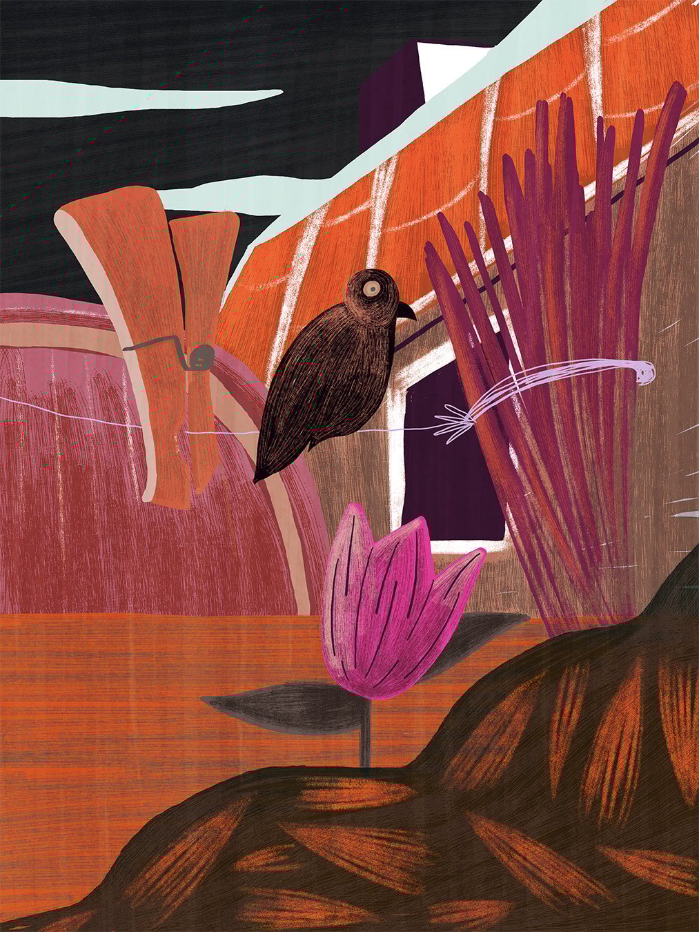 This is an imaginative illustration with only just a simple surreal art style to make it a beautiful scenery outside while this is not someone’s garden. It is complete imaginative with everyday things incorporated that do not necessarily make any sense.