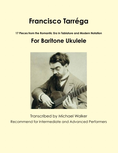 Here are eighteen compositions from the Romantic Era by Francisco Tarréga transcribed for the baritone ukulele. Most are also playable on the tenor and soprano ukulele and, of course, may be played on the guitar. These are somewhat more complex compositions and are for Intermediate to Advanced players.