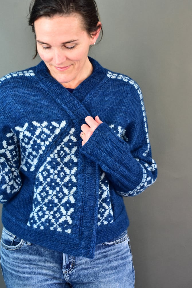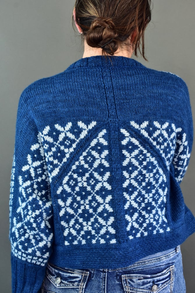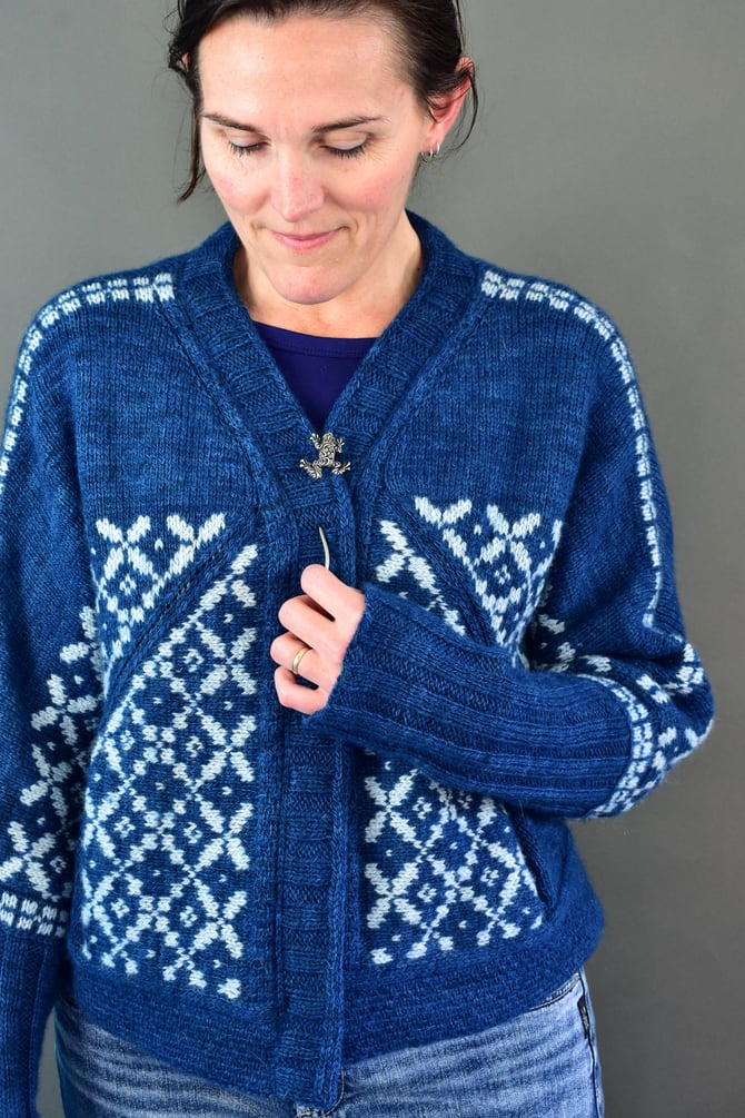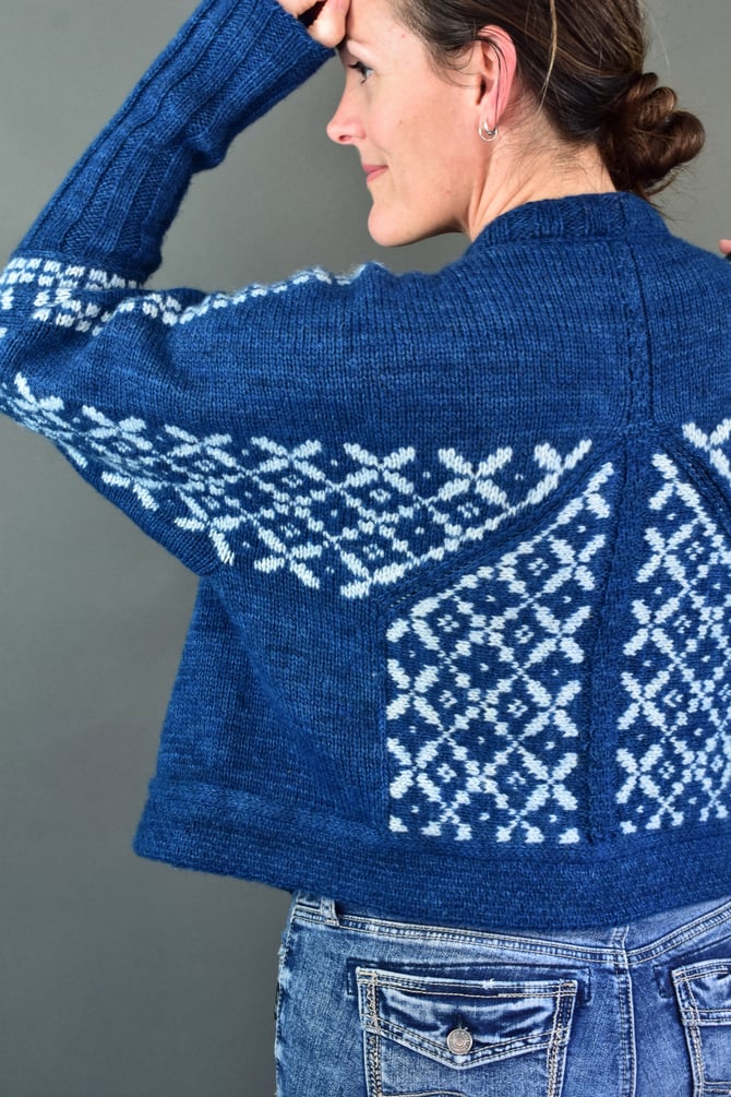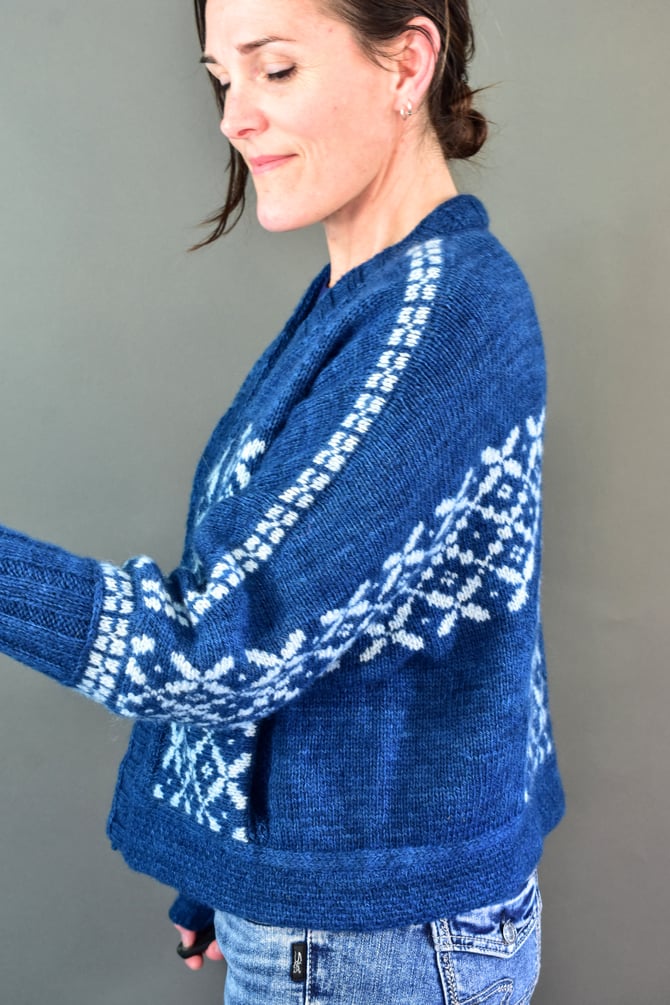 Botwood is a top‐down, open‐front dolman cardigan using the Stepaside construction. The upper back is worked first with short rows to shape the shoulders. The shoulder colourwork bands are worked in the round with a steek, then stockinette is continued down with short rows to shape the shoulders at the front. The large miter colorwork bands are worked on each half with a steek at the cuff and a steek at the hem. The underarm of each sleeve is worked, then the lower body is worked down to start of hem. In the end, the hem is worked, then the neckband, then the cuffs -- then the hidden set-in pockets ♡