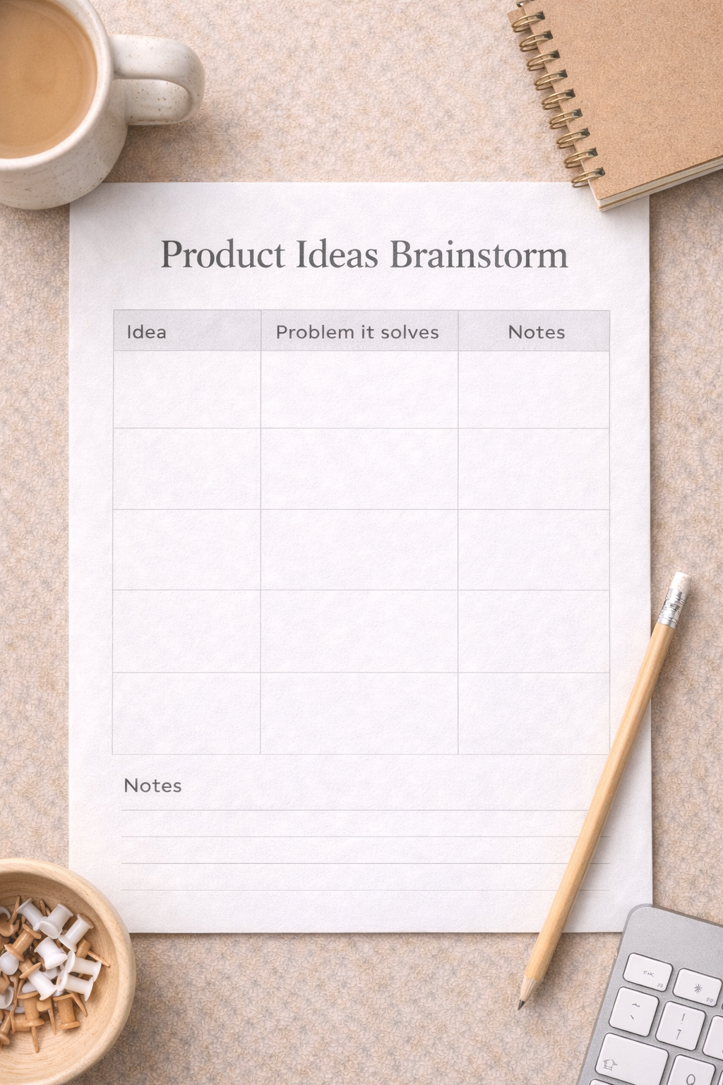 A focused brainstorming sheet for generating and organizing digital product ideas. Designed for creators who want clarity, direction, and actionable planning without theory.
