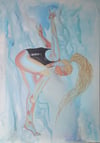 Her arms reach back and upward, stretched tensely as if yearning to break free from the freezing grip. The soft, fluid acrylic background of icy blues, whites, and grays heightens the sense of motion and the raw, unforgiving chill of winter.