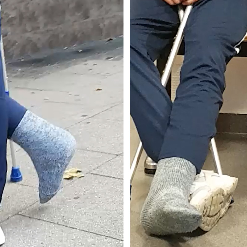 This younger patient (about 13-15 years old) had an appointment at doctor's office and arrived with his crutches, long sport pants and a cast on his left foot. He covered the cast with a quite thick wool sock completely. Despite the sock you can imagine how tight the cast is to support his broken foot. You can also see through the sock that the cast has a firm toeplate. Which kind of toes does he might have? Long toes, big toes, thick toes? Perhaps small and neat nails?