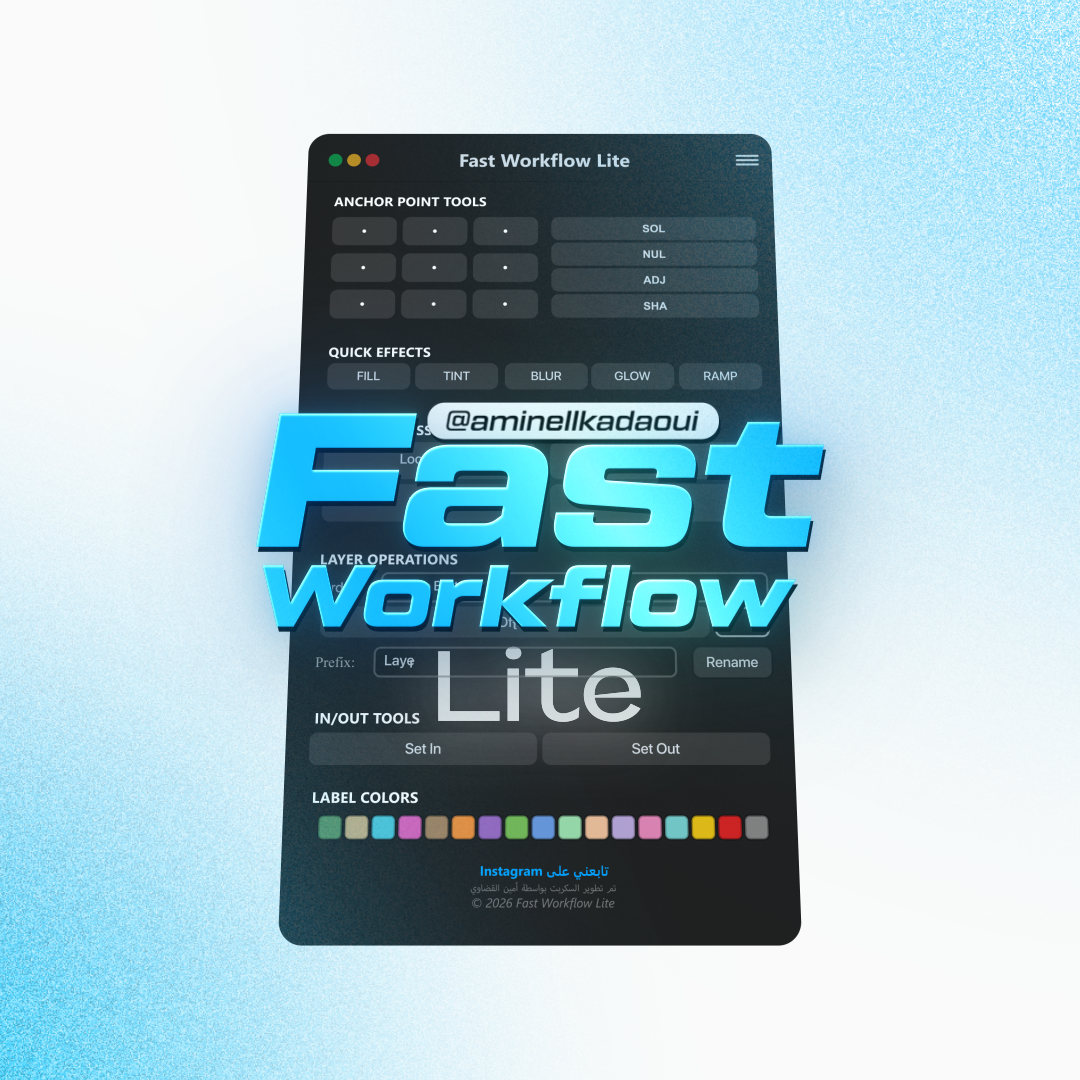 Fast Workflow Lite هو سكربت مجاني لبرنامج Adobe After Effects يهدف إلى تسريع سير العمل اليومي من خلال جمع أهم الأدوات الأساسية في لوحة واحدة بسيطة وسهلة الاستخدام.
