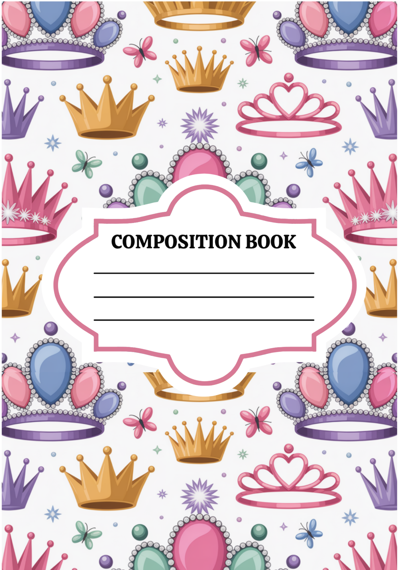 Make school magical with this adorable Princess Crowns Personalized Composition Book! Featuring pastel crowns, jewels, butterflies, and sparkles, this notebook is perfect for little queens who love glam and creativity. Each book comes with a custom name on the front cover, making it unique and special for your child.