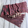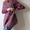 Two Pass Woven Knitting repeats a small, easy to memorize stitch pattern. Different motifs appear from different colour sequences established in the setup rows. The length of this wrap is cast on and worked in the round. After bind off, the wrap is steeked and the fringe is formed from the cut edge.