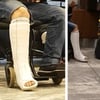 A FRESHLY APPLIED SLC SPLINT ON A BOY'S RIGHT FOOT.