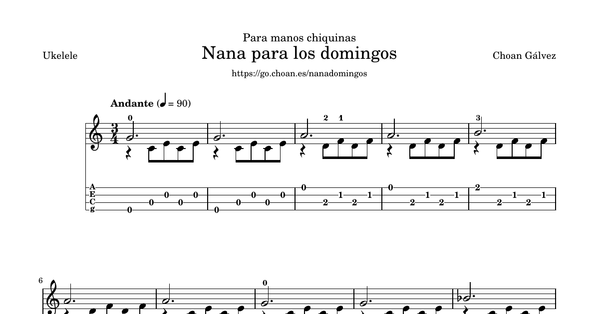 Partitura (notación musical y tablatura) para ukelele solo de Nana para los domingos, una composición de Choan Gálvez.
