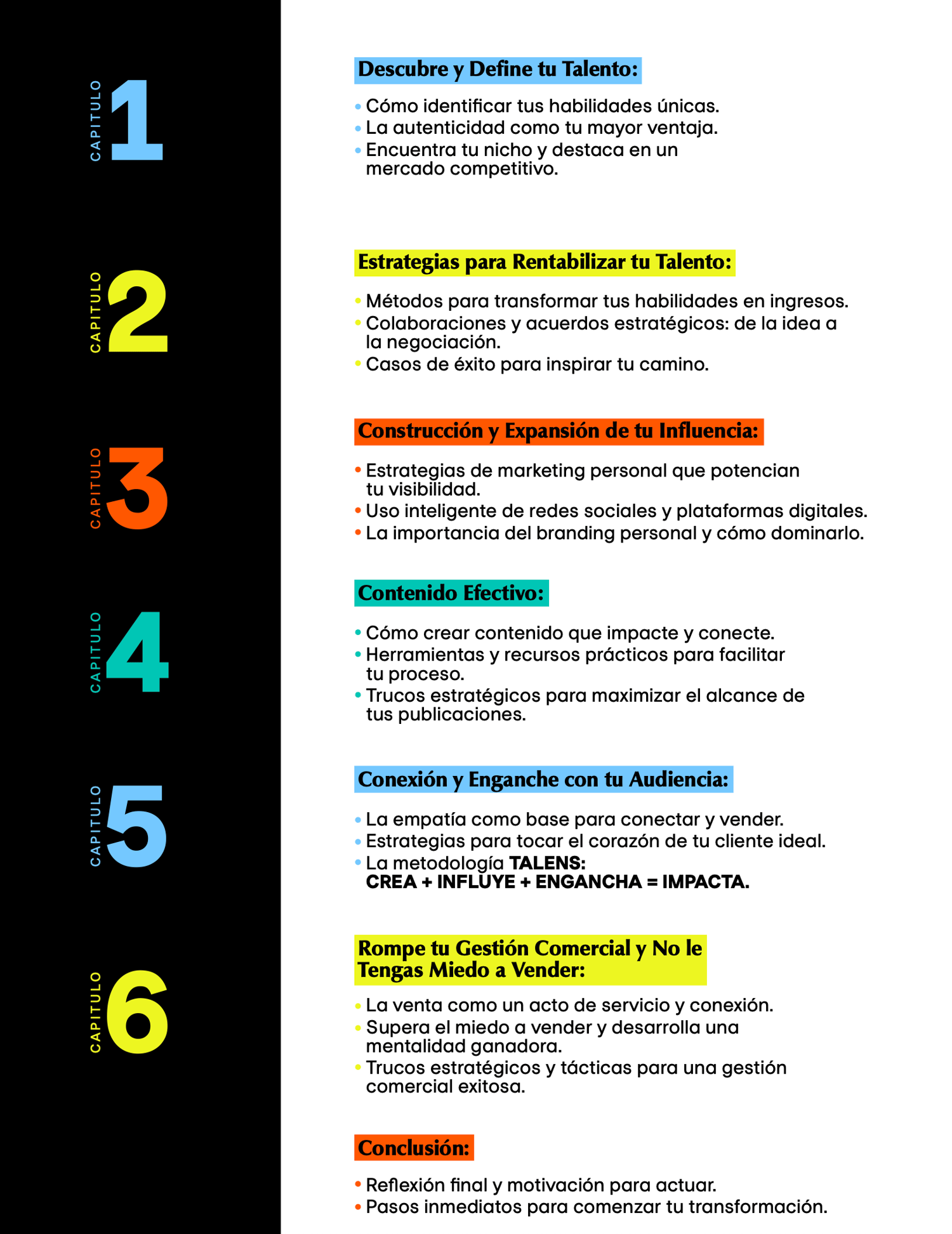 Aquí descubrirás cómo empaquetar lo que sabes hacer —eso que por años has hecho bien pero no sabías cómo monetizarlo— para convertirlo en una oferta irresistible, estratégica y potente. Aprenderás a comunicar tu valor de forma clara, a construir una comunidad que te escuche y confíe, y a desarrollar una mentalidad comercial que te permita vivir con más libertad, propósito y resultados.