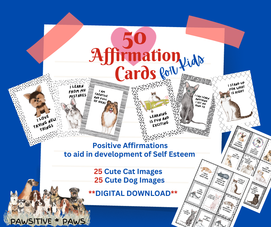 AFFIRMATIONS FOR KIDS Cards (25 Cards with Cat images AND 25 Cards with Dog images)