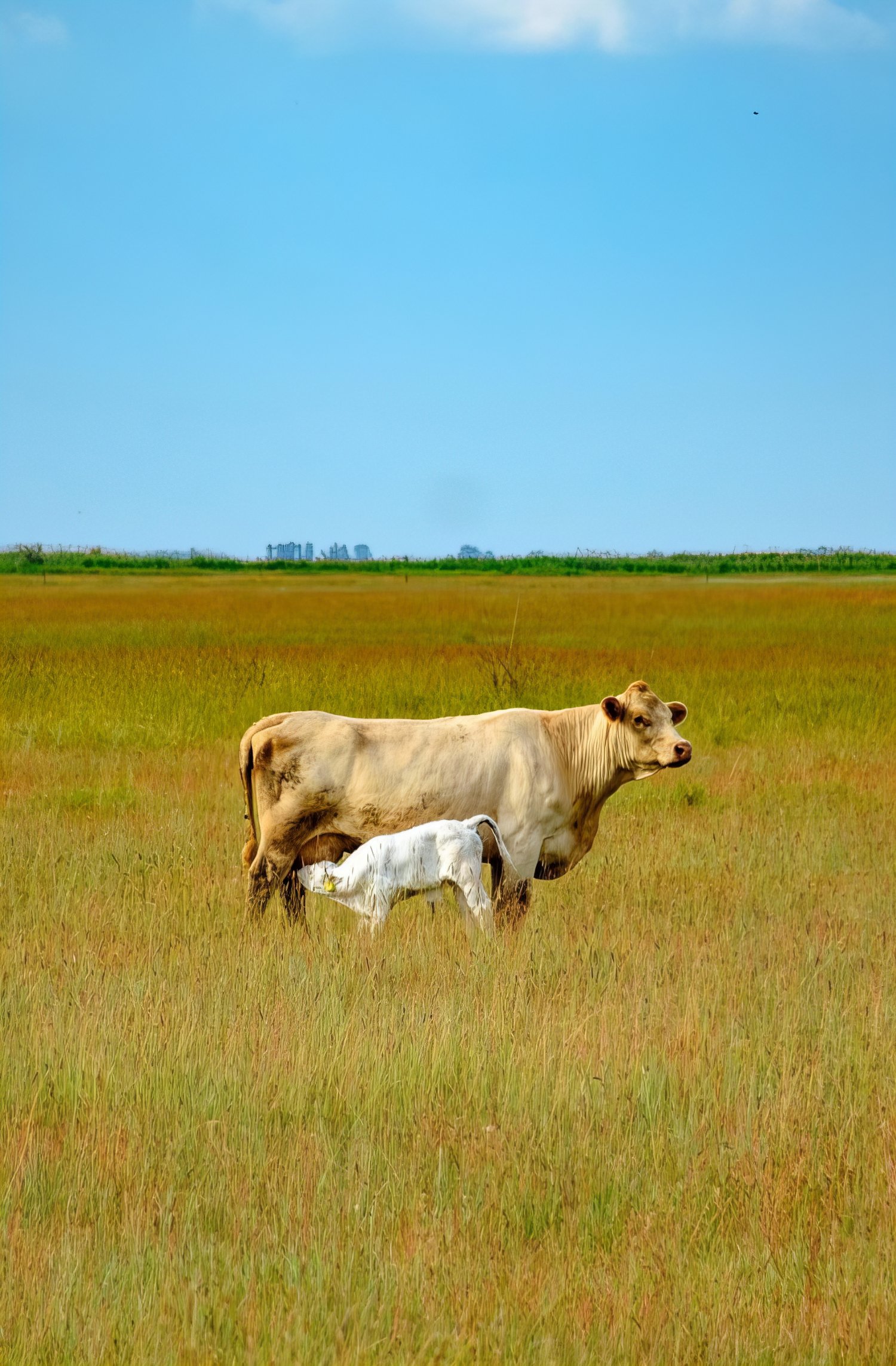 cow, calf, nursing, livestock, pasture, grassland, animal, mammal, rural, nature, agriculture, farming, meadow, field, outdoor, motherhood, domestic, cattle, sky, mammal, young, peaceful, environment, countryside, agriculture, horizon, standing, grass, blue, mammalian, nurturing, wildlife, summer, brown, white, farmland