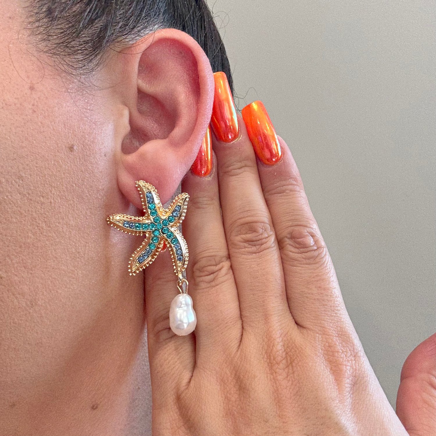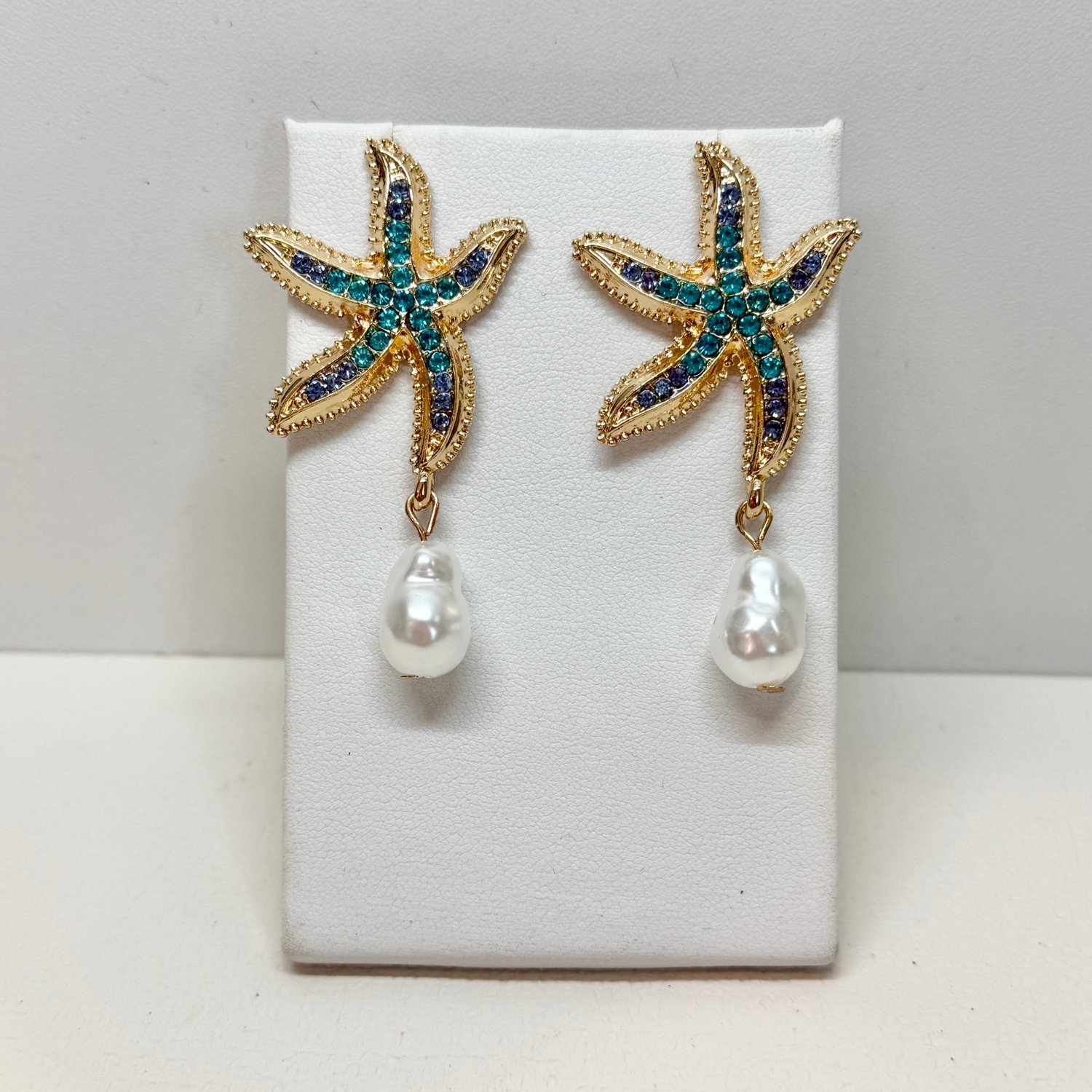 Starfish gold tone post earrings with aqua and blue rhinestones and dangle faux pearls.