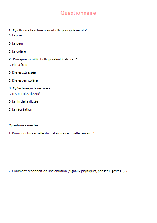 - Un questionnaire (QCM + questions ouvertes)