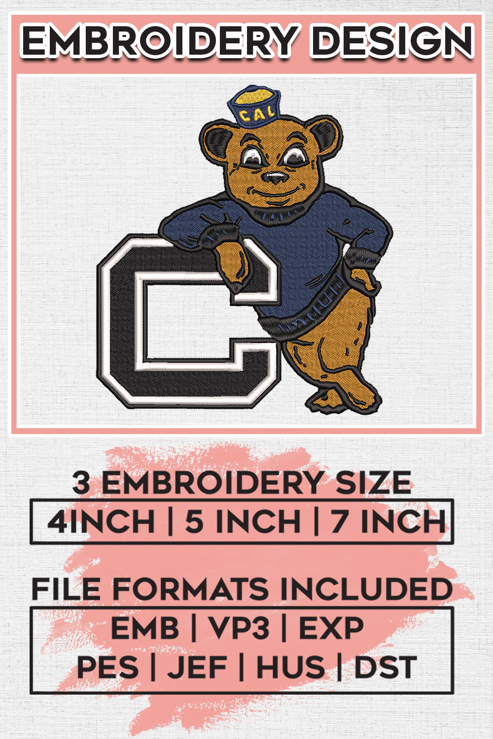 #NCAACaliforniaGoldenBears #GoldenBearsMascot #EmbroideryDesigns #MachineEmbroideryFiles #NCAALogoEmbroidery #CaliforniaGoldenBears #DigitalEmbroidery #EmbroideryPatterns #SportsEmbroidery #NCAAFans #GoldenBearsLogo #EmbroideryArt #DIYEmbroidery #EmbroideryDownload #TeamMascotEmbroidery #NCAASports #CustomEmbroidery #EmbroideryFiles #CollegeSportsEmbroidery #GoldenBearsDesigns