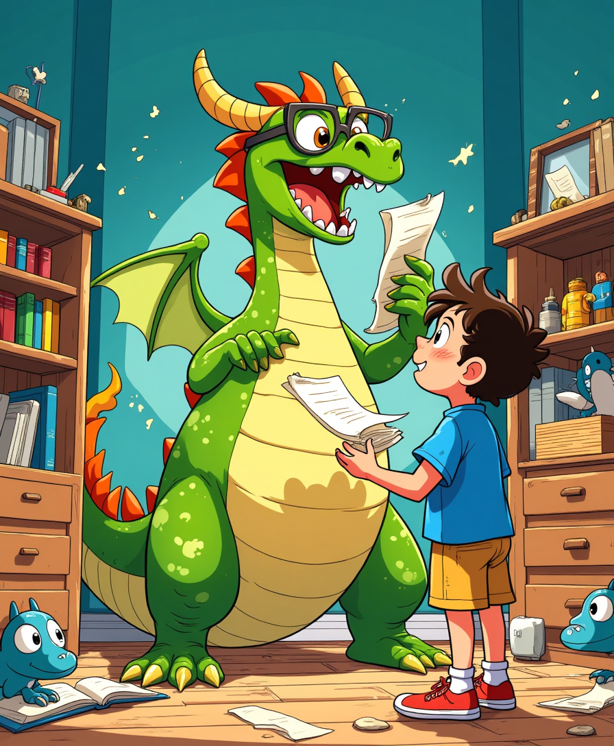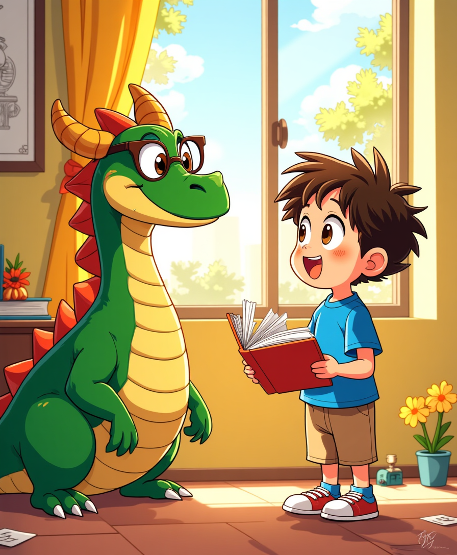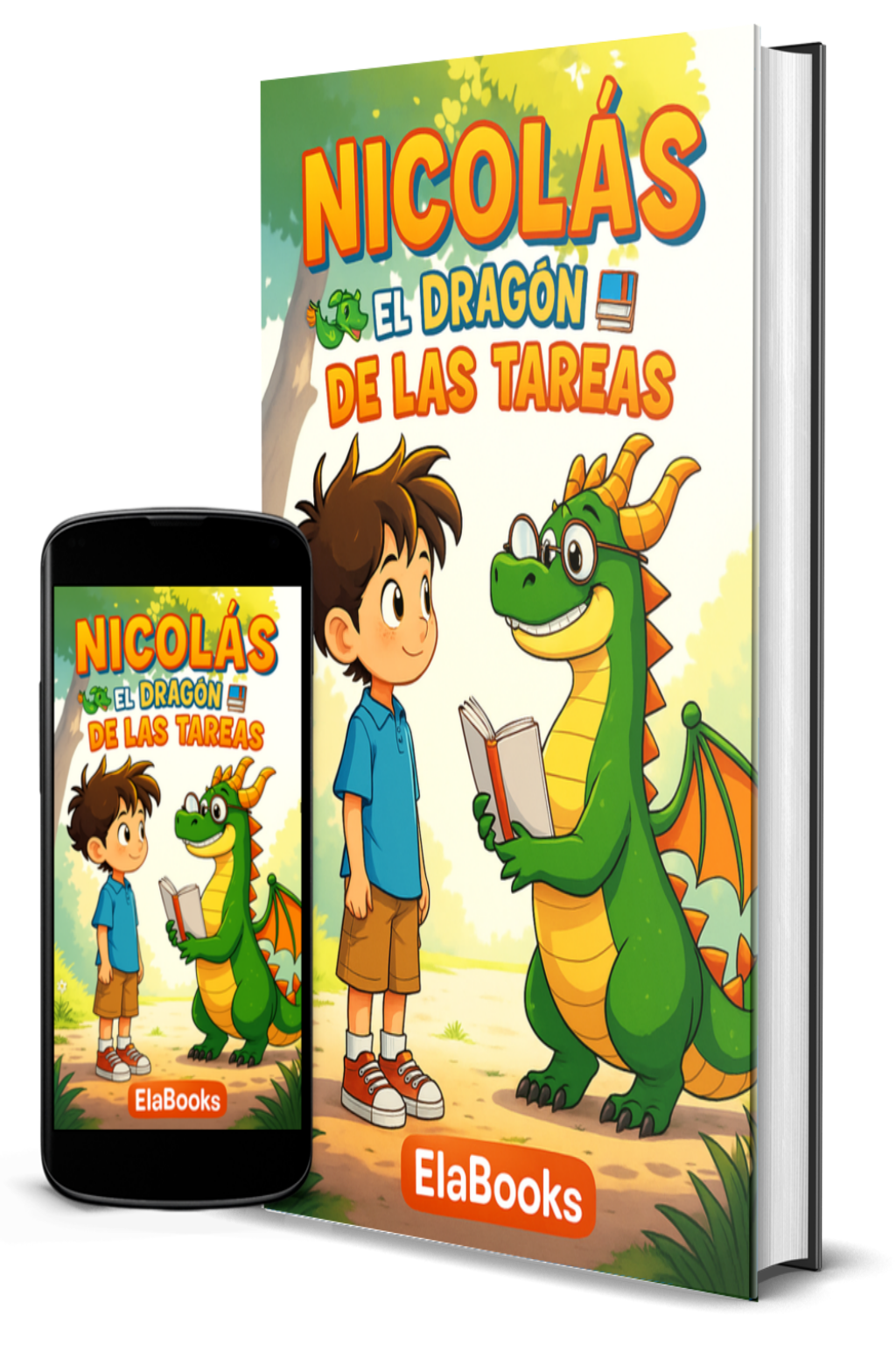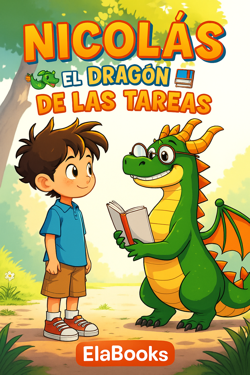 Nicolás es un niño curioso de 7 años que siempre encuentra algo más divertido que hacer en lugar de sus tareas escolares 🎮⚽. Pero todo cambia cuando conoce a un dragón verde con lentes 🤓🐉 que aparece en su patio con un libro mágico 📖.
