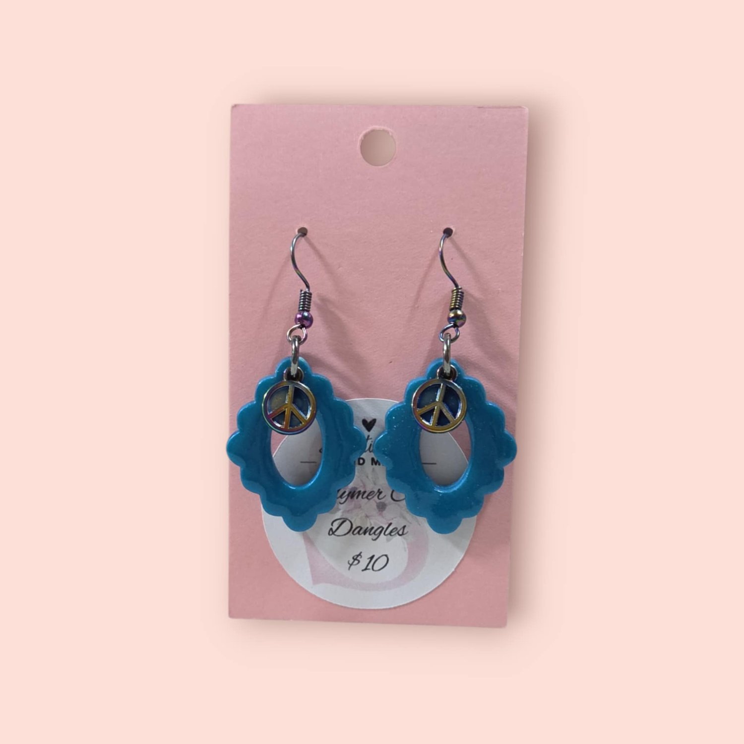 Stand out with these bold, handmade polymer clay dangles in a deep turquoise blue that catches the eye. Sculpted into a unique abstract shape—somewhere between organic and modern—each earring features a small metallic peace sign charm that adds a cool, edgy touch. Lightweight and hypoallergenic for all-day comfort. No two pairs are the same, and this design won’t be repeated. Peace, style, and individuality—all in one.