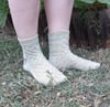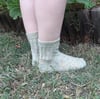 Ricochets socks include a motif pattern of slipped stitches which intersect and intertwine as circles in the water. This motif is much easier that it seems.