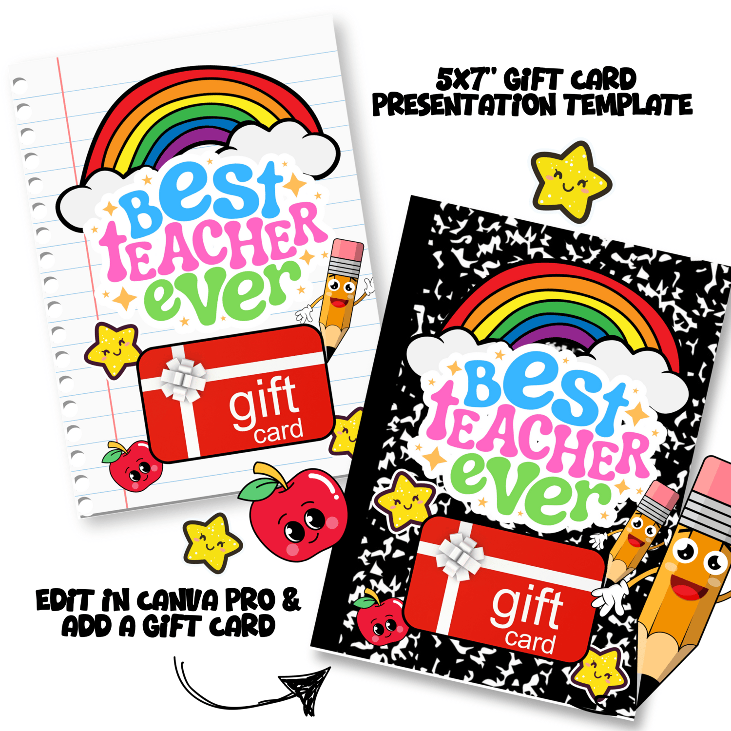 Show your appreciation in style with this Best Teacher Ever Gift Card Template Bundle! Perfect for beginning of the year, end of year, Teacher Appreciation Week, holidays, or just because! This bundle includes two professionally designed 5x7” gift card templates, fully editable in Canva Pro so you can personalize them with your own messages, colors, fonts, or school name.