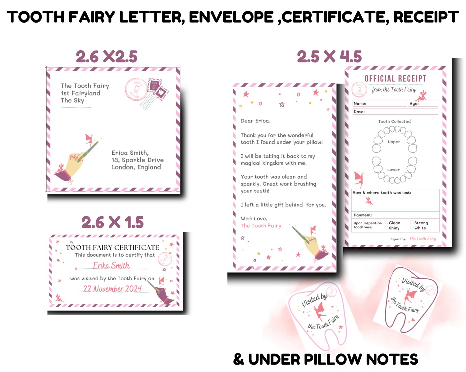 Mini Tooth Fairy Set Pink, Envelope, Letter, Receipt, Certificate, Pillow Notes, Door Hangers