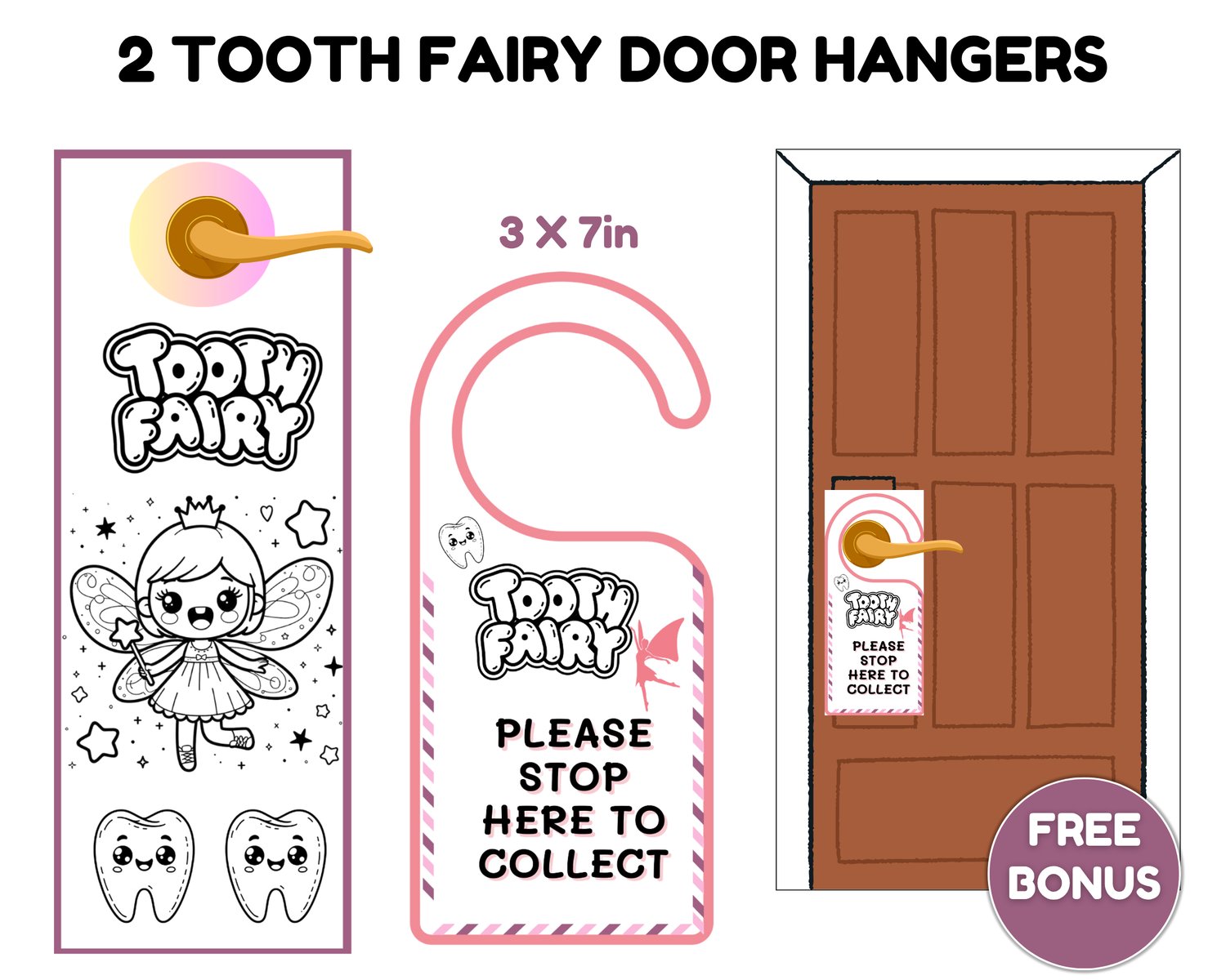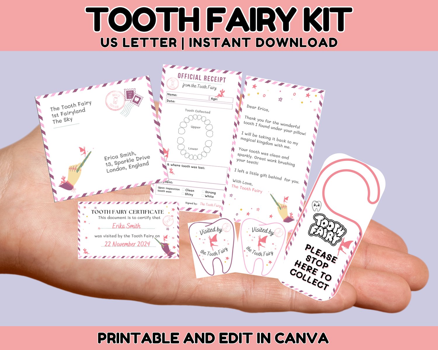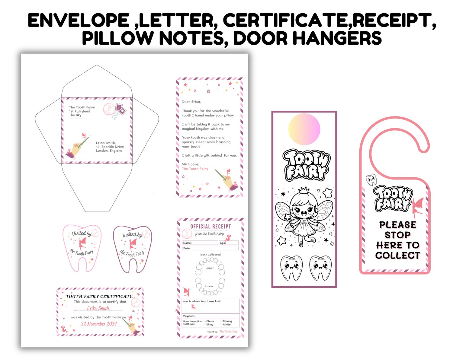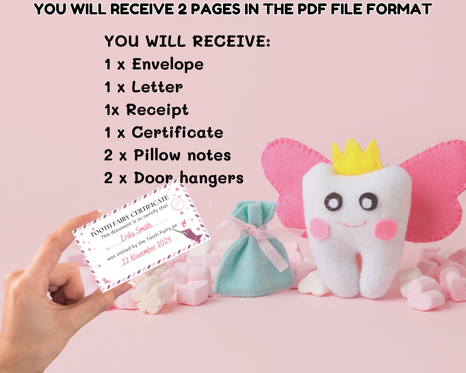 The set includes a Tooth Fairy Letter with a mini envelope, Tooth Fairy Receipt, Fairy Tooth Certificate, 2 x Tooth Fairy pillow notes, and 2 tooth fairy door hangers (your child can color in one). Losing teeth has never been this much fun!