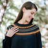 Mabel is knit seamlessly from the top down. The yoke is cast on and short rows are worked to raise the back of the neck for a comfortable fit. The colorwork yoke is knit, then the body and sleeves are separated and worked from the top down. The collar is picked up and knit. Collar, cuffs and hem are bound off with a contrasting color.