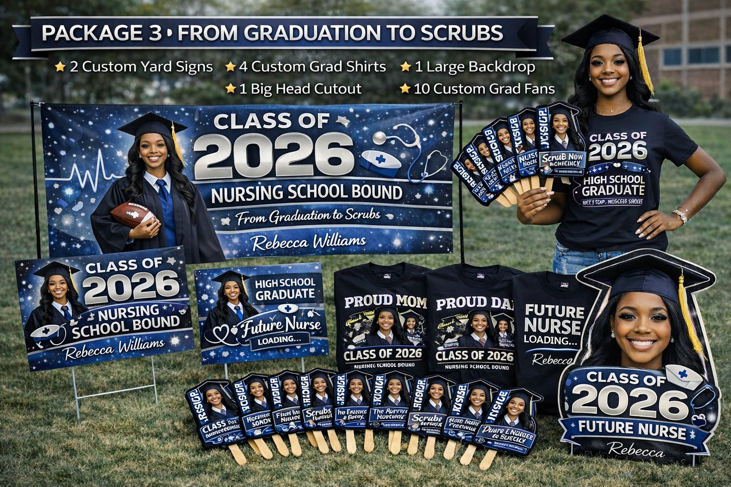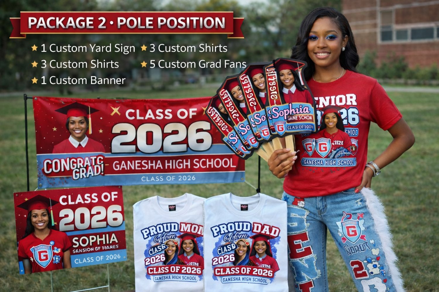 Each bundle includes high-quality, personalized graduation items perfect for photos, parties, and keepsakes.