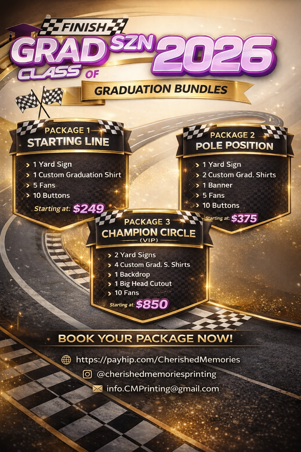 Celebrate your graduate in style with our Grad SZN Class of 2026 Graduation Bundles, designed to make their big moment unforgettable. Whether you’re looking for a simple celebration or a full VIP experience, Cherished Memories Printing offers professionally crafted, fully customizable graduation packages to fit every need.