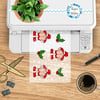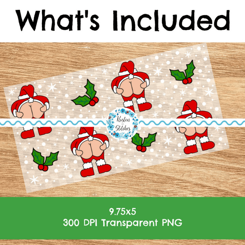 Features Santa Claus bearing his backside with holly berries and snowflakes.