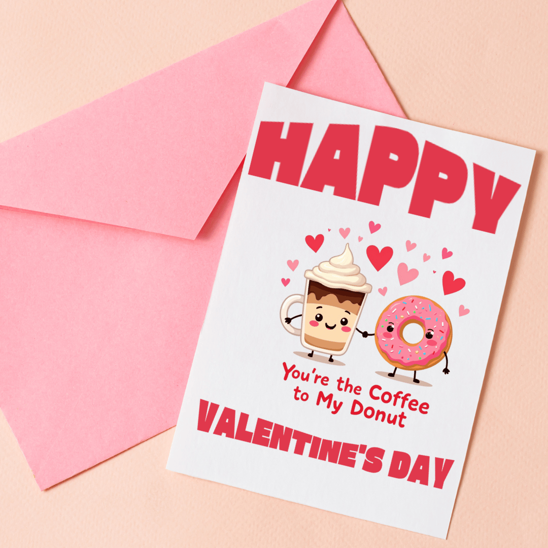 A playful, heart-warmingly cute greeting card that says what sugary feelings alone can’t. Bright, high-definition artwork shows an espresso cup and a pink-frosted donut holding hands beneath a scatter of hearts, with the cheeky line “You’re the Coffee to My Donut.” The layout is bold and easy to read — large headline text at the top, the illustration centered, tuck into a lunchbox, leave on a doorstep, or hand across a cafe table on Valentine’s Day or any day you want to share a little sweetness.