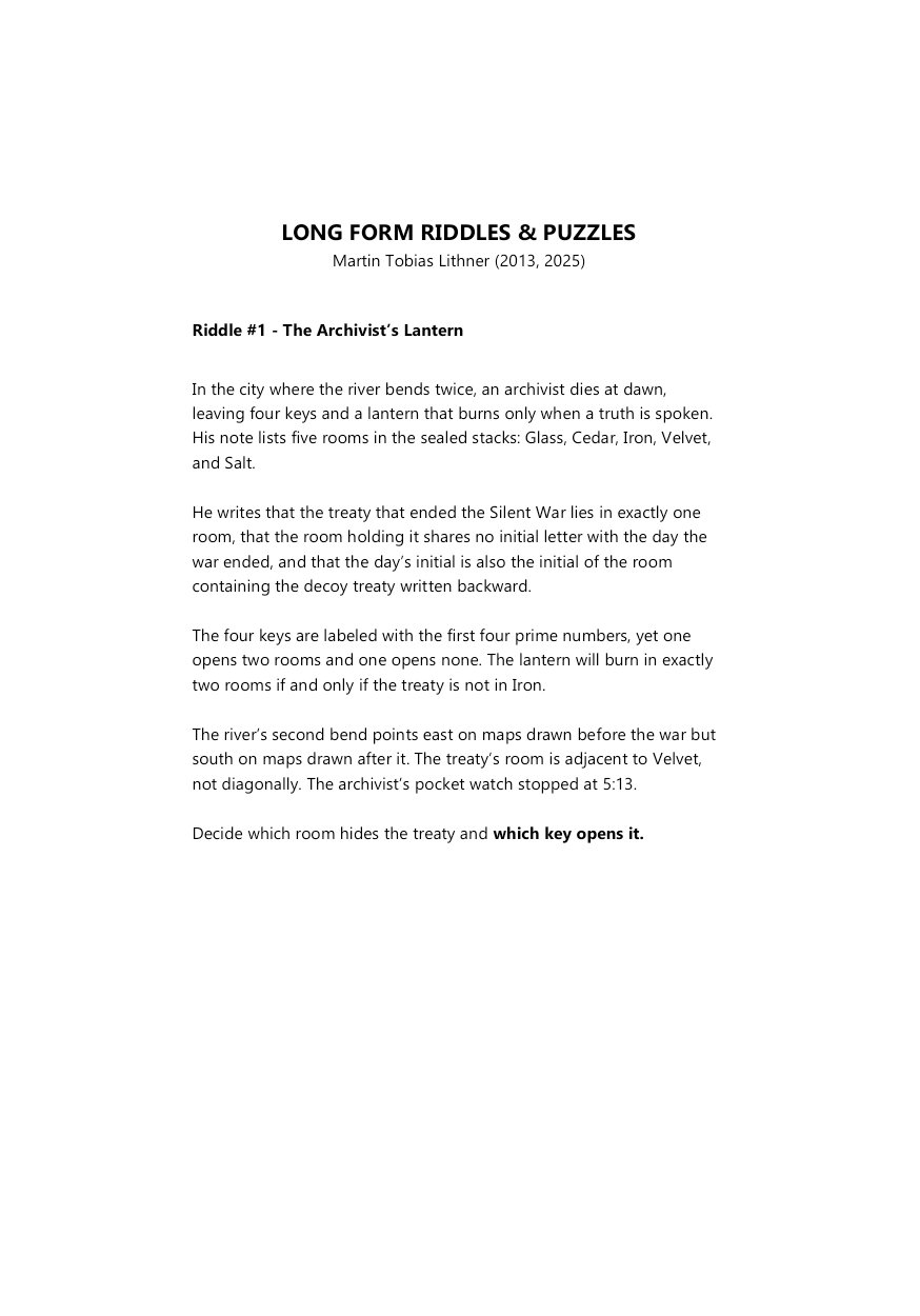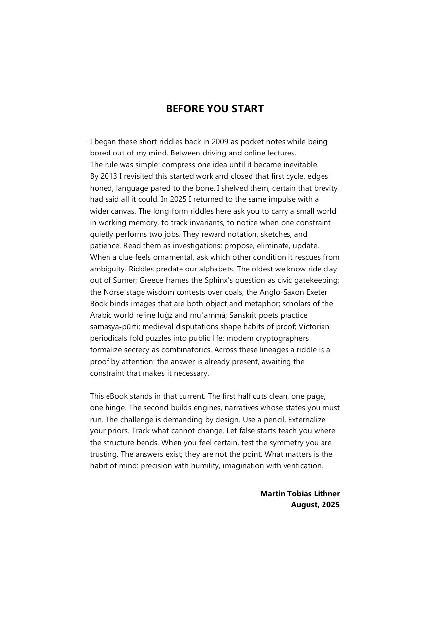 Riddles for Brilliant Minds by Martin Tobias Lithner is a field manual for precision thinking. Forged in two arcs, 36 razor-edged short form riddles (2009–2013) and 10 story-length long form labyrinths completed in 2025. This collection demands memory, notation, and disciplined inference.