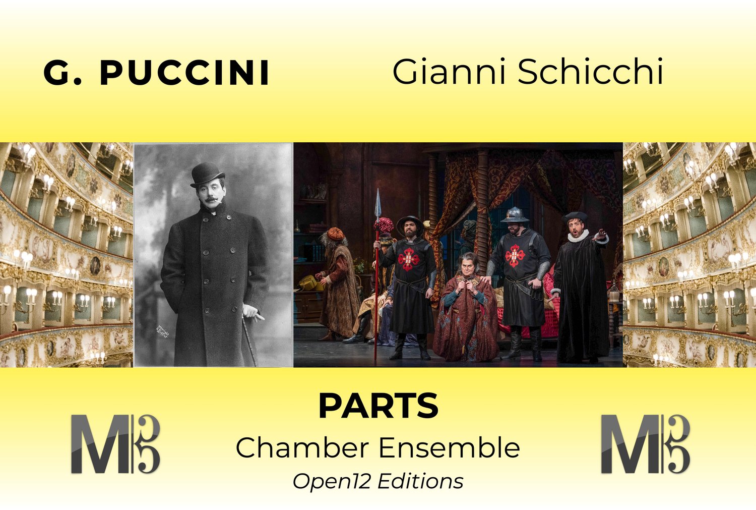 With only one player per string part, careful attention must be given to sound balance. Unlike the Chamber Orchestra version, which includes a fuller string section, the reduced string forces can be easily overpowered by winds or percussion. We recommend subtle amplification of the strings where possible, or alternatively, strategic dynamic adjustments—such as reducing wind and percussion volume—to maintain clarity and ensemble blend. Gianni Schicchi for Chamber Ensemble is under preparation and will require: