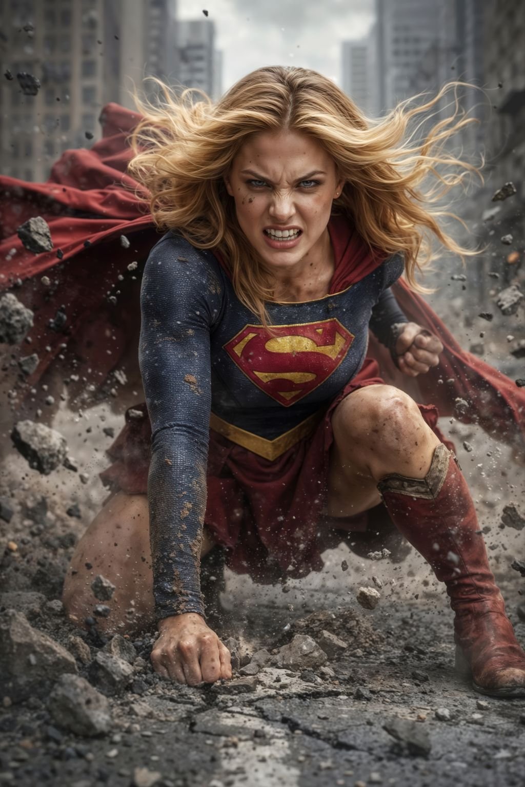 A 10K fantasy artwork of Supergirl slamming down into a shattered city street, captured at the exact moment rubble erupts and dust storms the frame. Her cape whips behind her like a battle banner, while her fierce, teeth-bared glare sells pure defiance—she’s hurt, grounded, and still unstoppable. Gritty realism, high-impact motion, and cinematic atmosphere make this piece feel like a freeze-frame from an apocalyptic hero saga.