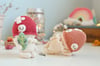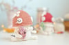 Amanita es una seta amigurumi de tamaño pequeño. Si haces a Amanita y Li con los materiales arriba explicados, medirá aproximadamente 12 y 4 cm de alto respectivamente.