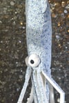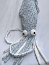 This one-of-a-kind squid is made of 100% upcycled fabric, in this case a smooth cotton with a pattern of blue flowers and trailing leaves, with white cotton for the underside and eyes. (The pupils are made of felt, and handsewn, not embroidered.) Each one is unique--no exact colour combination is repeated and there are only limited amounts of each upcycled fabric in any case--and has its own personality. The squid is about 4' long (or 120cm), but half of that length is noodly appendages.