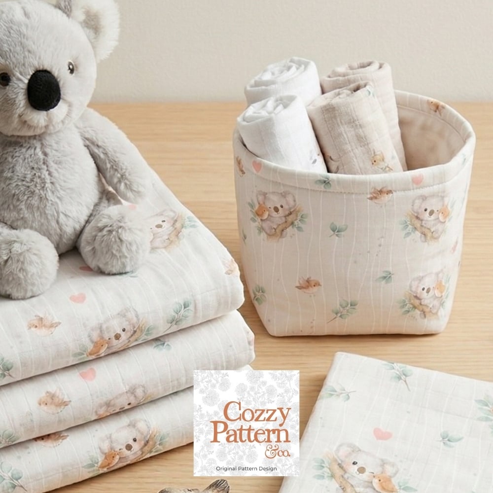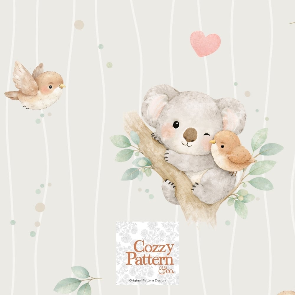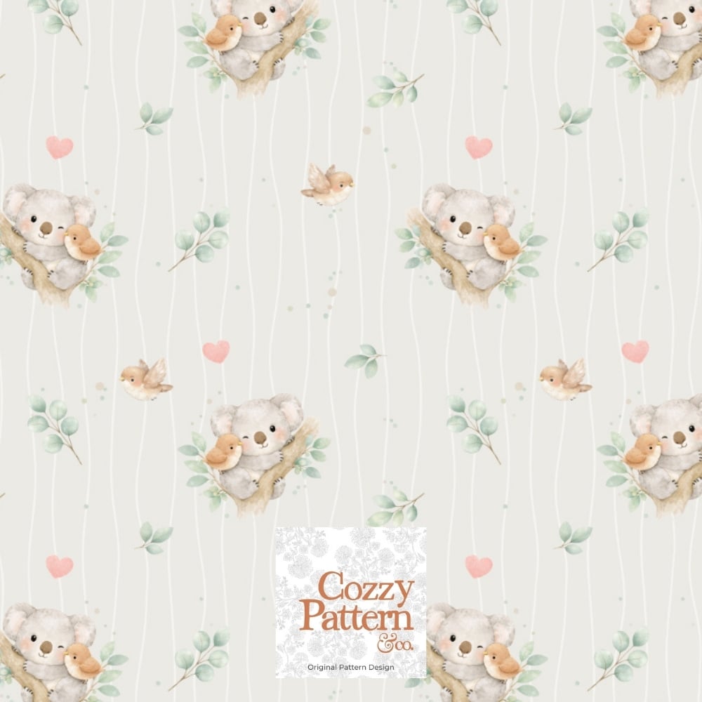 Create sweet and comforting baby projects with this seamless pattern featuring adorable baby koalas in a soft and peaceful setting, surrounded by delicate leaves and tiny hearts.