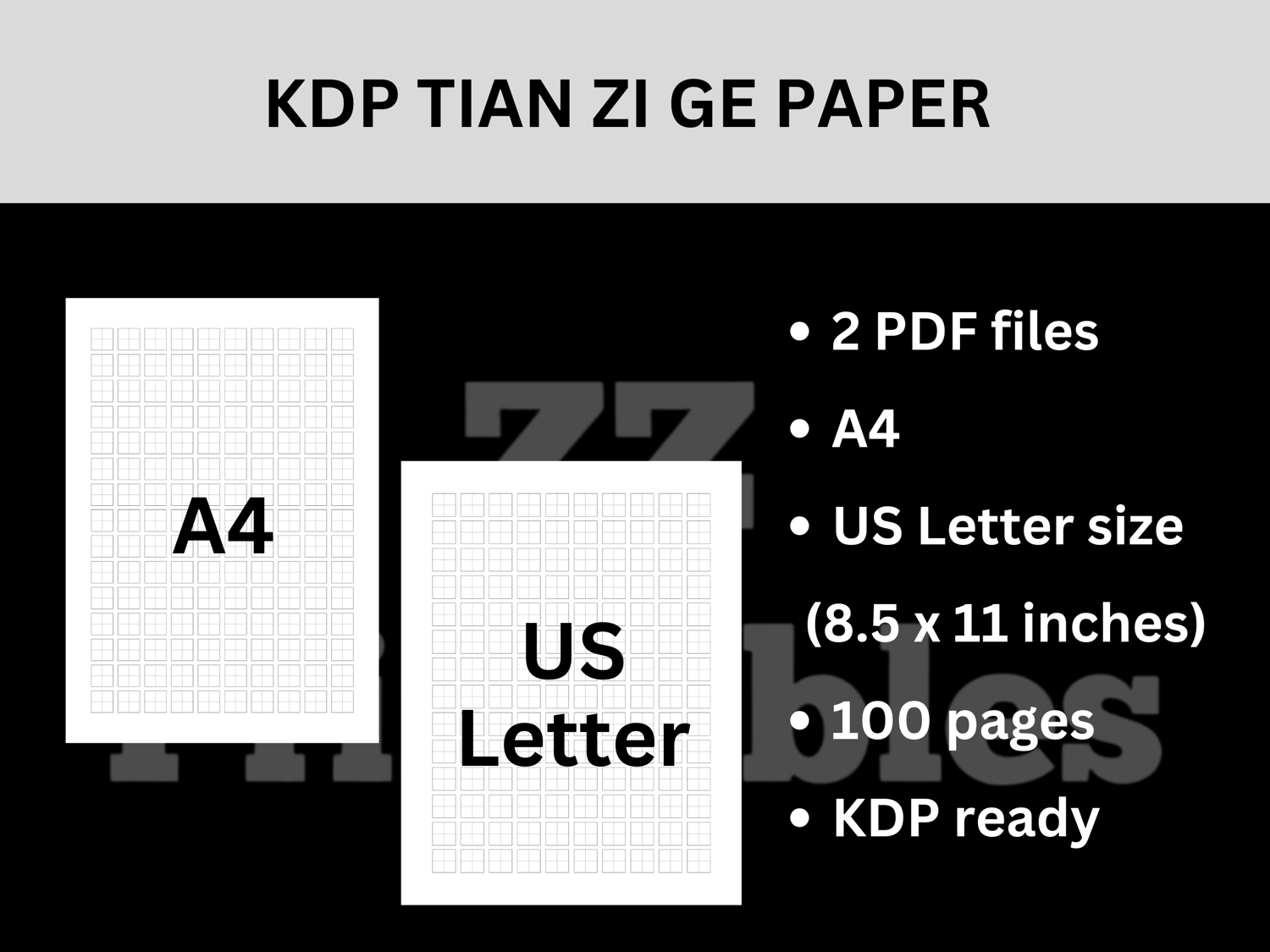 Two Tian Zi Ge writing paper notebook templates for self-publishing low content books on Amazon KDP (Kindle Direct Publishing). Ready to upload. Hanzi writing practice paper is great for men, women, boys, and girls who are beginners of the Mandarin or Cantonese language and learning how to write Chinese characters and scripts.