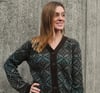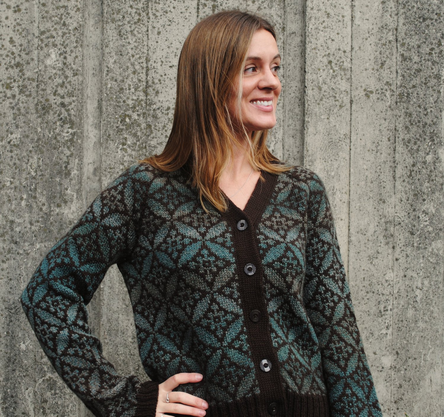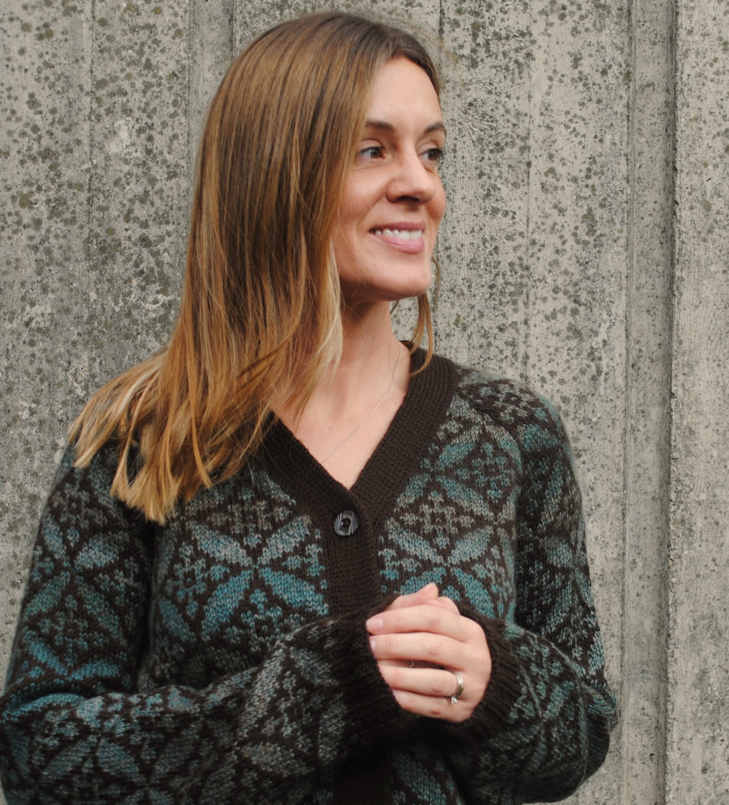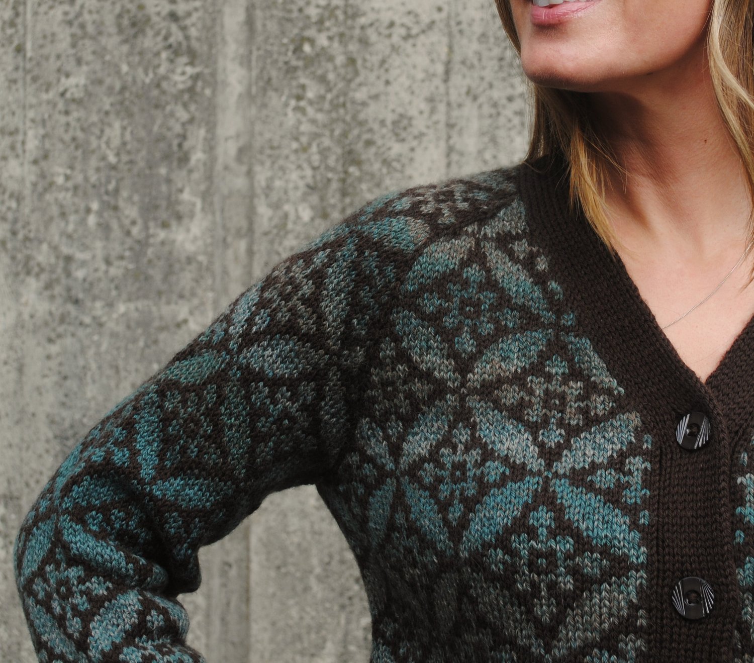 Stranded colourwork is worked throughout the yoke, body and sleeves. The yoke can be worked either flat or in the round with a steek. For the cardigan, the body can also be worked flat or in the round with a steek; for the V-neck sweater, the body is worked in the round. Sleeves are worked in the round. Waistband and cuffs are worked in 2x2 ribbing. The neckband is worked either in 2x2 ribbing or double knit.