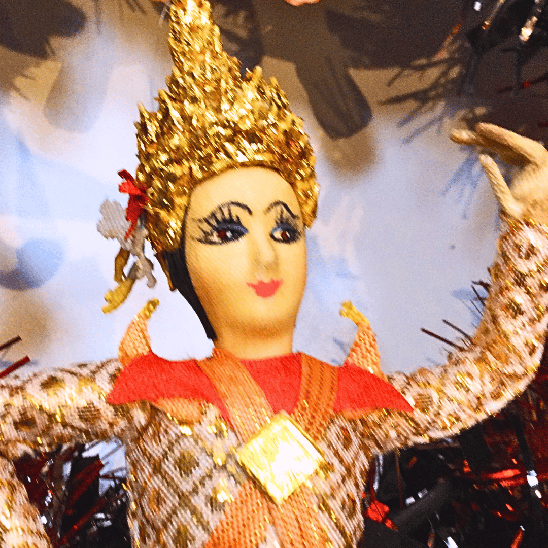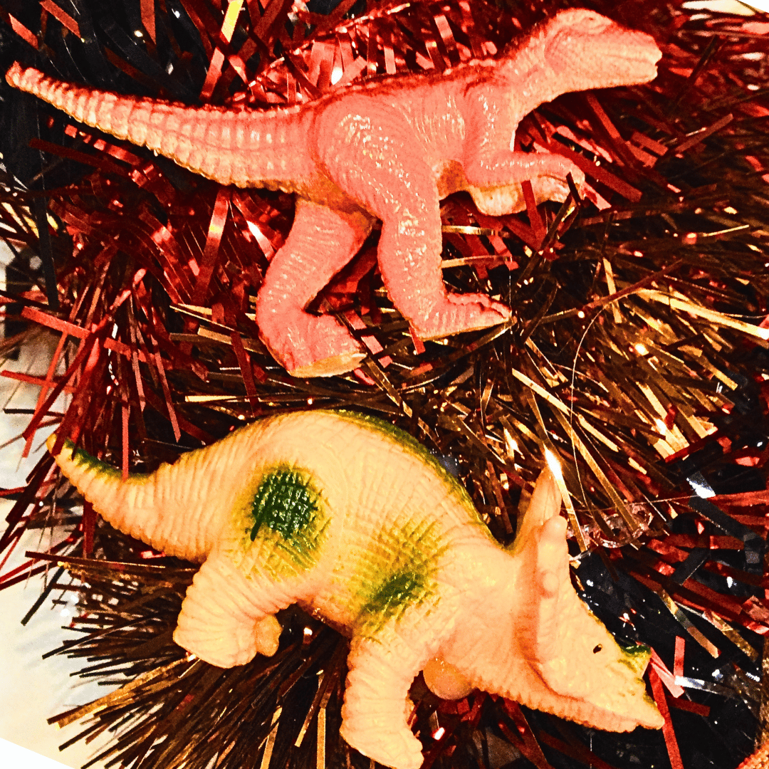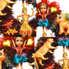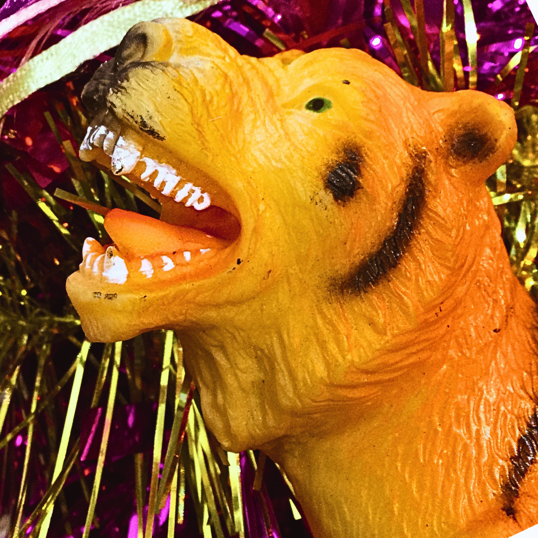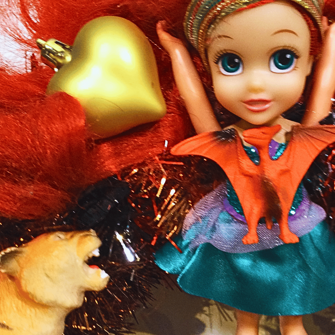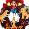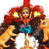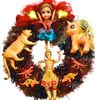 Check out these super dolls, tigers and dinosaurs, all blinged up in amazing jewel-bright colours, cantering around this sparkly one-of-a-kind wreath. Would be cool for Diwali as well as Christmas as it's so glowing and bright, fusing Eastern and Western objects.