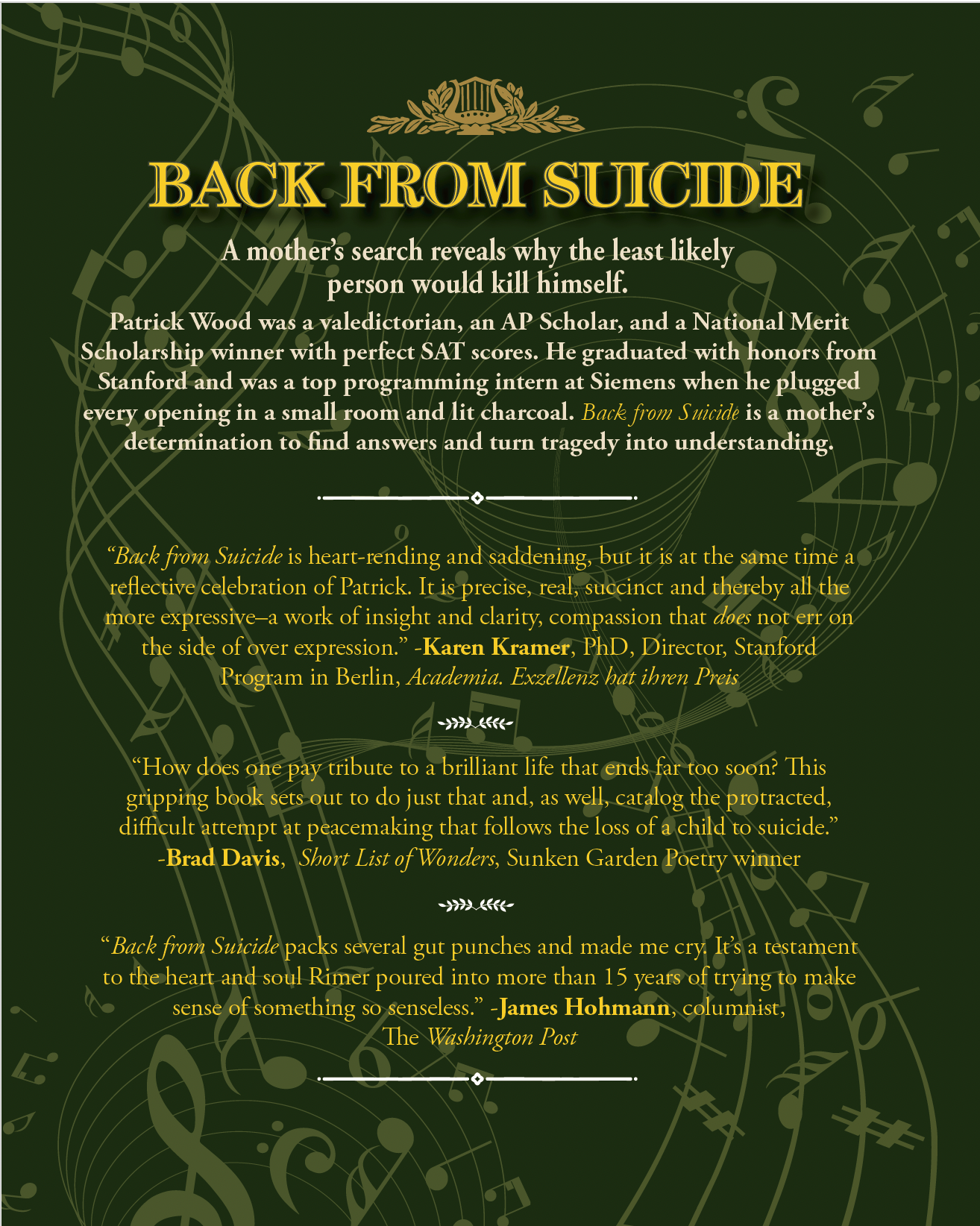 Back from Suicide reveals the suicidal mind through the misery of depression and the difficulty of coming out. It’s about the enigma of self-destruction after a lifetime of success. It is a mother’s pursuit of the biggest question of humankind—why do people kill themselves? Rimer learns what she should have done, what she should have said, what parents need to know, and, in spite of mistakes, how she emerged Back from Suicide.