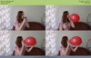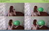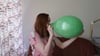 Emilia blows a red balloon until it pops. The green balloon flew away before it popped.