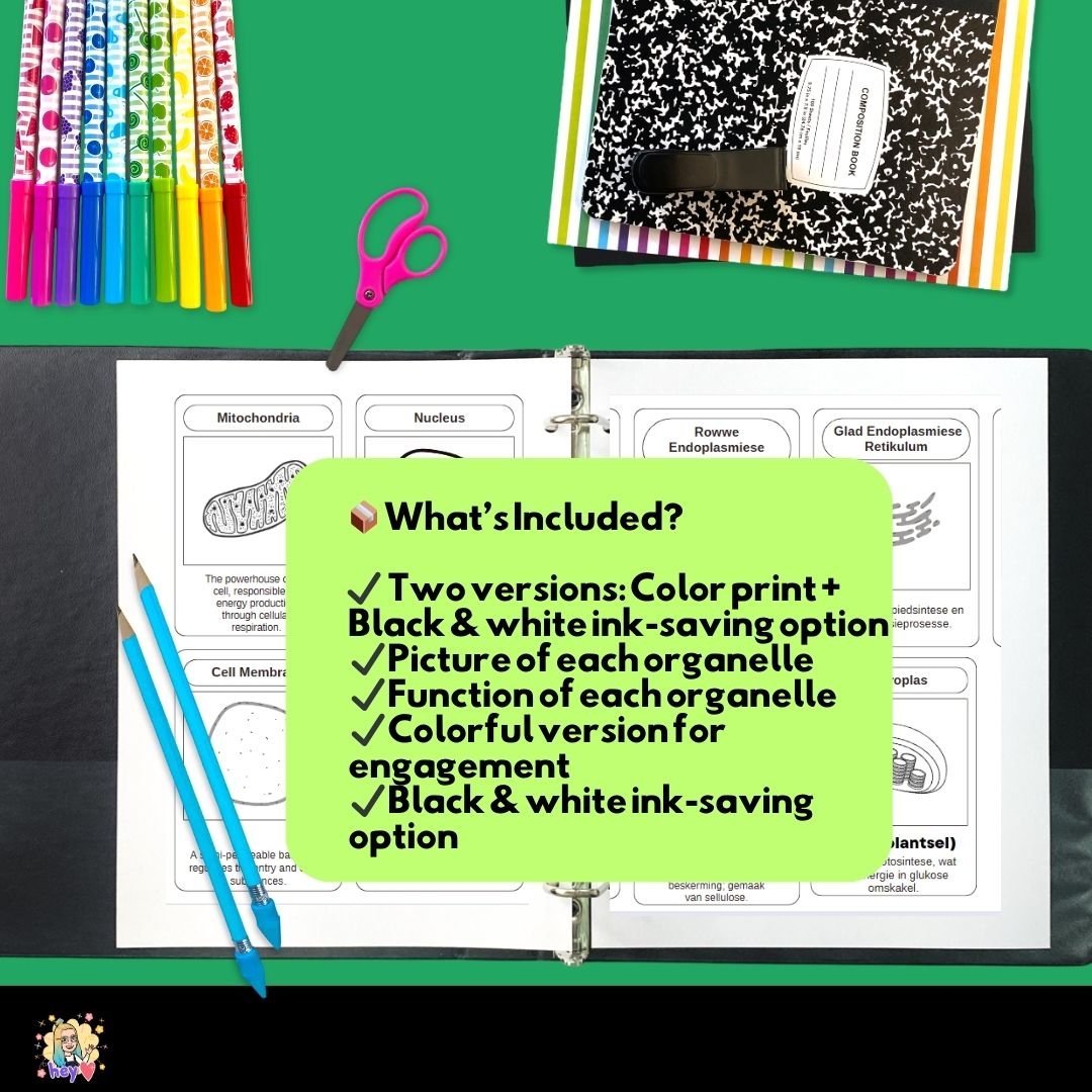 ✅ Printable flashcards with organelles and functions in English & Afrikaans