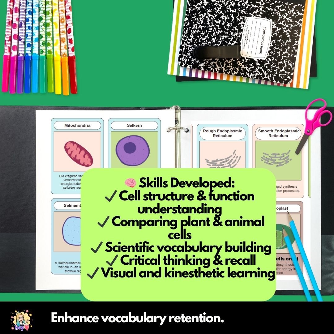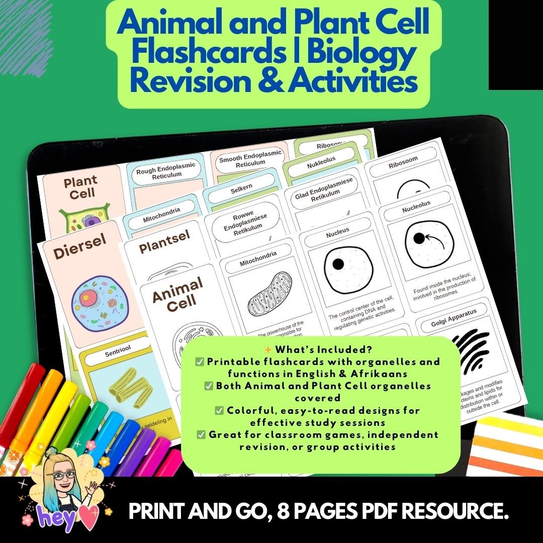 Help students understand cell organelles in both English and Afrikaans with these bilingual Animal & Plant Cell Flashcards! These study cards provide key biology terms and definitions in both languages, making them an excellent tool for bilingual classrooms and learners improving subject-specific vocabulary.