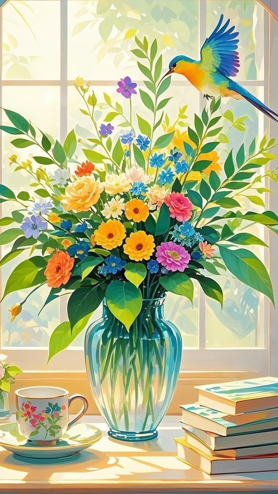 This artwork beautifully captures a sense of serenity and joy. The composition is well-balanced, with the vibrant bouquet of flowers as the central focus, framed by the soft glow of sunlight streaming through the window. The vivid colors of the blossoms—yellows, oranges, pinks, and blues—are harmoniously blended, creating a cheerful yet elegant mood. The small bird hovering gracefully above the flowers adds a touch of liveliness and symbolizes freedom and nature’s beauty. The inclusion of everyday objects, such as the tea cup and stacked books, brings warmth and a cozy atmosphere, making the scene relatable and inviting.