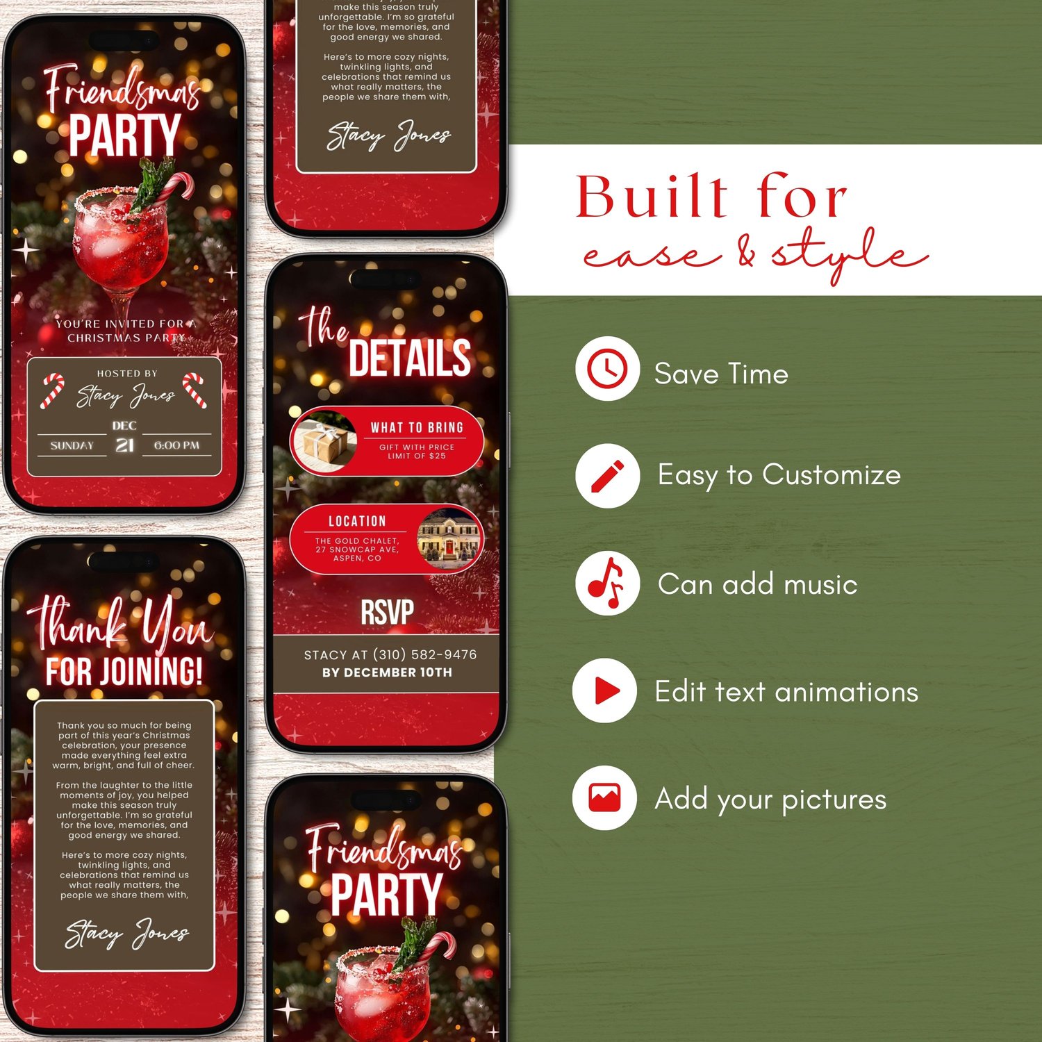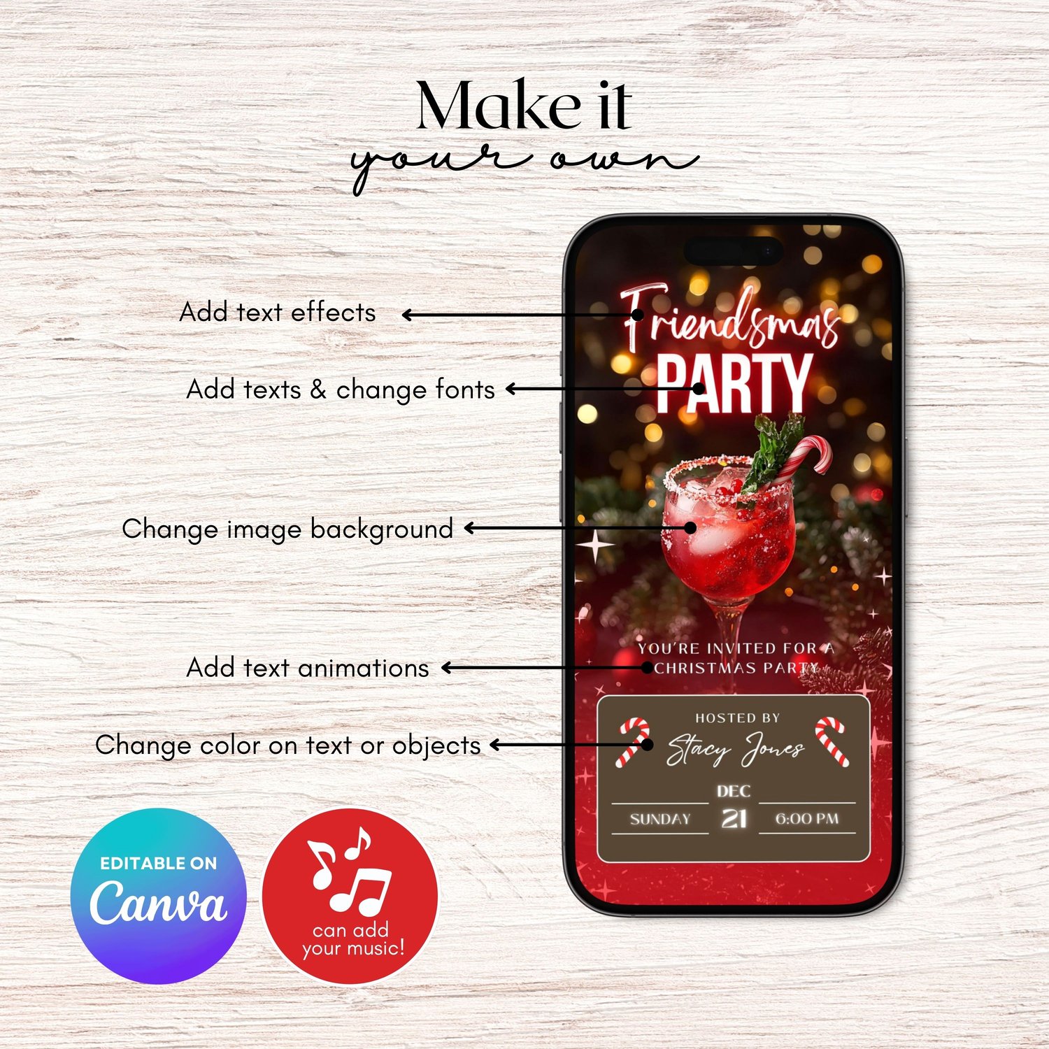 Easily customize your invite in Canva (Free or Pro) โ edit text, photos, and colors, or add animations to create a lively and memorable video invitation. Share it instantly via message, email, or social media and spread the Christmas cheer!