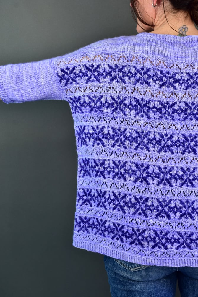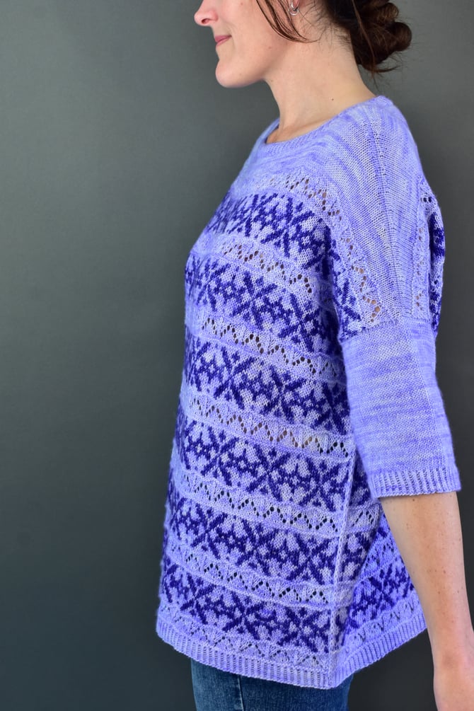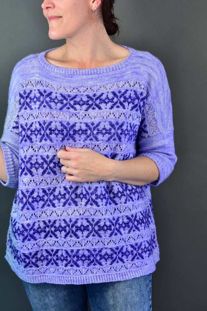 A top down, drop shoulder, over sized sweater with the essence of shells infused into the bands of lace and stranded colourwork.