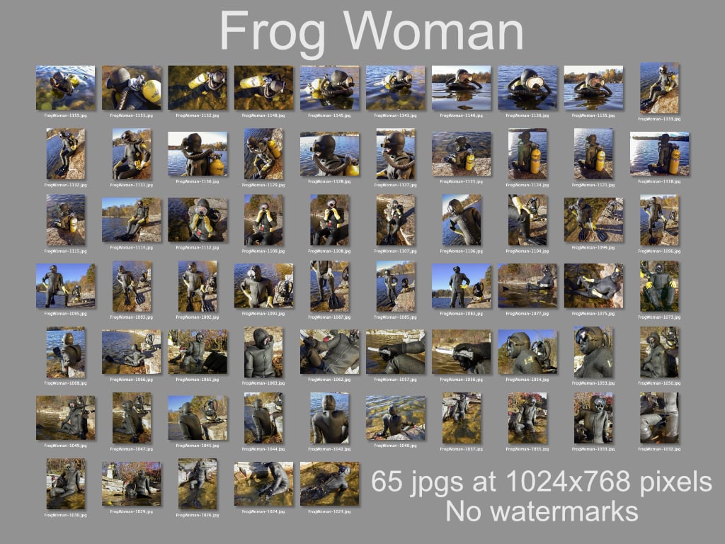 "Frog Woman"- Set contains 65 images at 1024x768 pixels free of watermarks. Downloadable as a single .Zip file. No nudity. Copyright 2004.