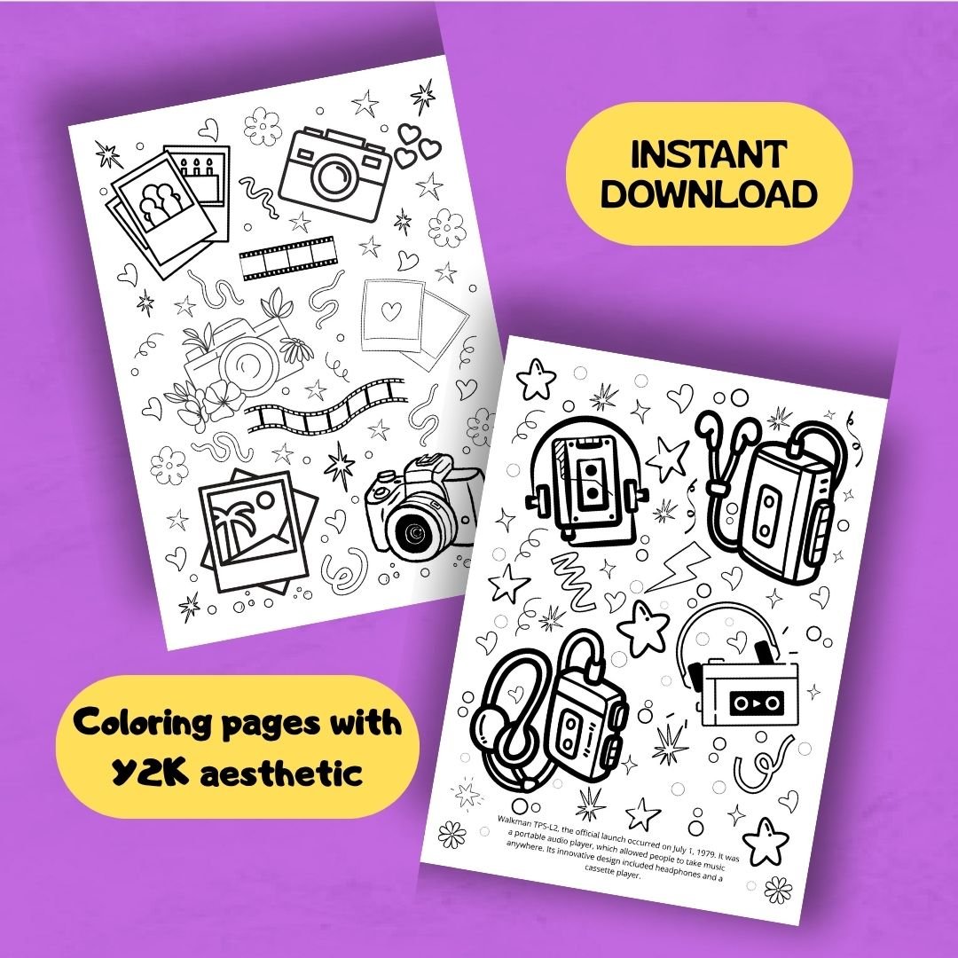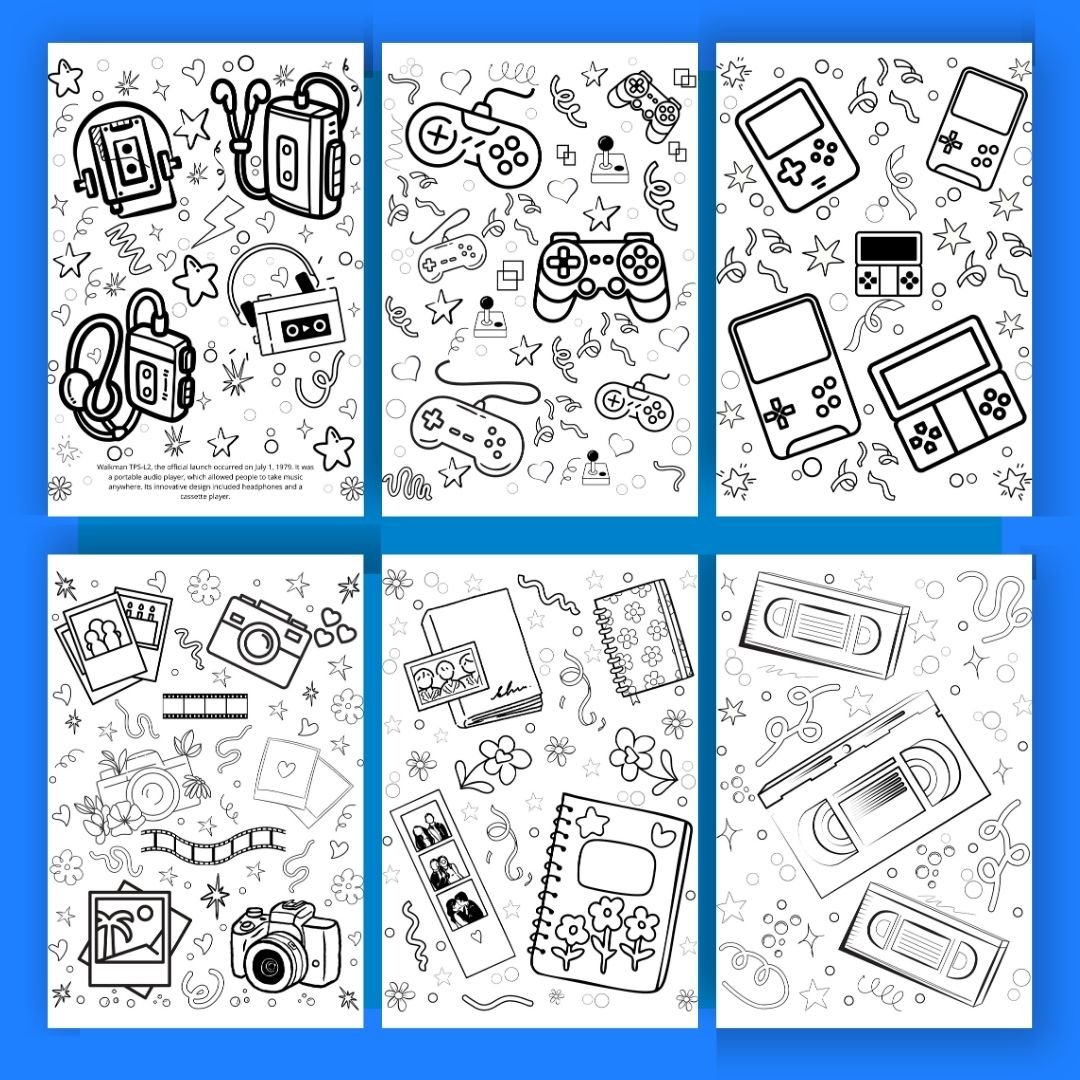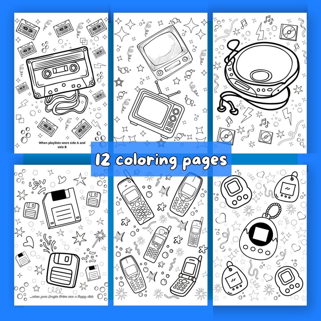Relive memories of the 90s with the objects we used to listen to music, watch TV, photo albums, diskettes, cell phones, etc. These detailed coloring pages are ideal for adults and teenagers who enjoy aesthetic and retro art.