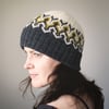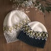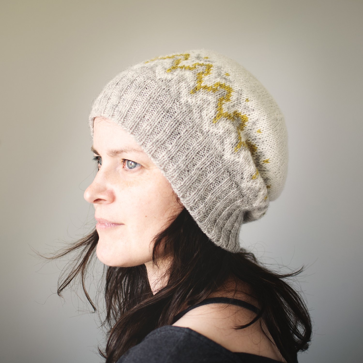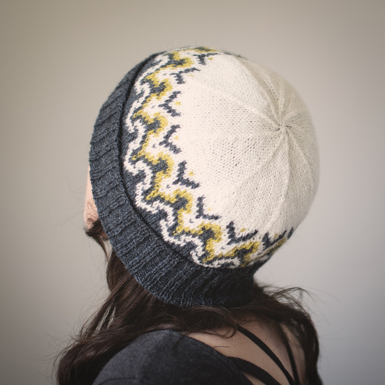 The hat is worked bottom up in the round and starts with a tubular cast-on for 2x2 ribbing. An adjustment round immediately after the brim sets the stitch count for the colorwork pattern, which is worked using three colors at a time for most of the chart. Then there are a few plain colored rounds (depending on your chosen version) to knit before the hat is finished with shaping for the crown.