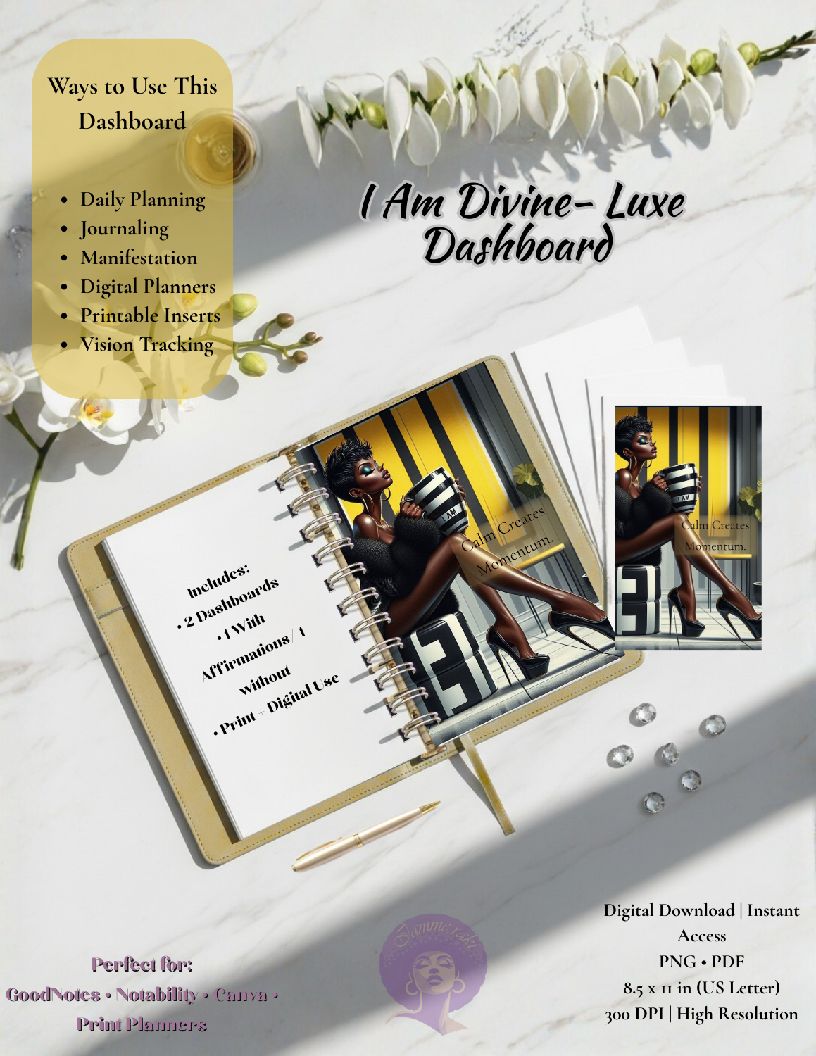 The I AM Divine Dashboard is created for women who move with intention, confidence, and unapologetic self-expression. Rooted in modern luxury, melanated beauty, and calm boss energy, each dashboard transforms your planner or journal into a daily ritual of alignment, focus, and affirmation.